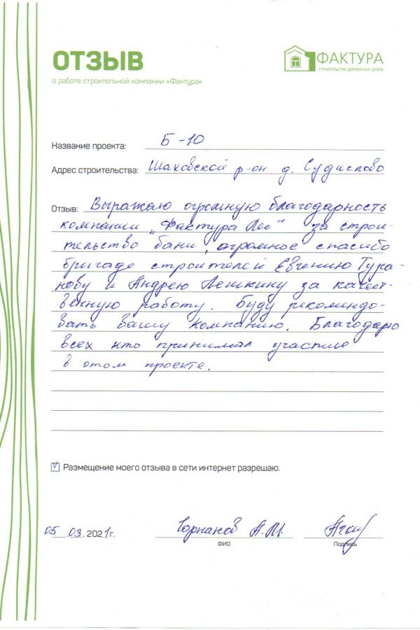 Выражаю огромную благодарность компании «Фактура Лес» за строительство бани. Огромное спасибо бригаде строителей Евгению Туранову и Андрею Лешкину за качественную работу. Буду рекомендовать вашу компанию. Благодарю всех, кто принимал участие в этом проекте.