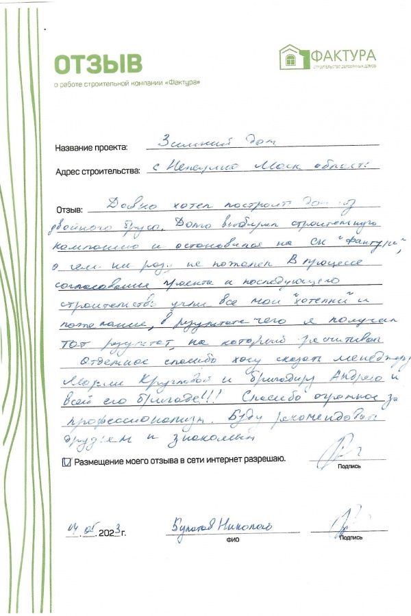 Давно хотел построить дом из двойного бруса. Долго выбирал строительную компанию и остановился на СК «Фактура», о чем ни разу не пожалел. В процессе согласования проекта и последующего строительства учли все наши «хотелки» и пожелания, в результате чего я получил тот результат, на который рассчитывал.