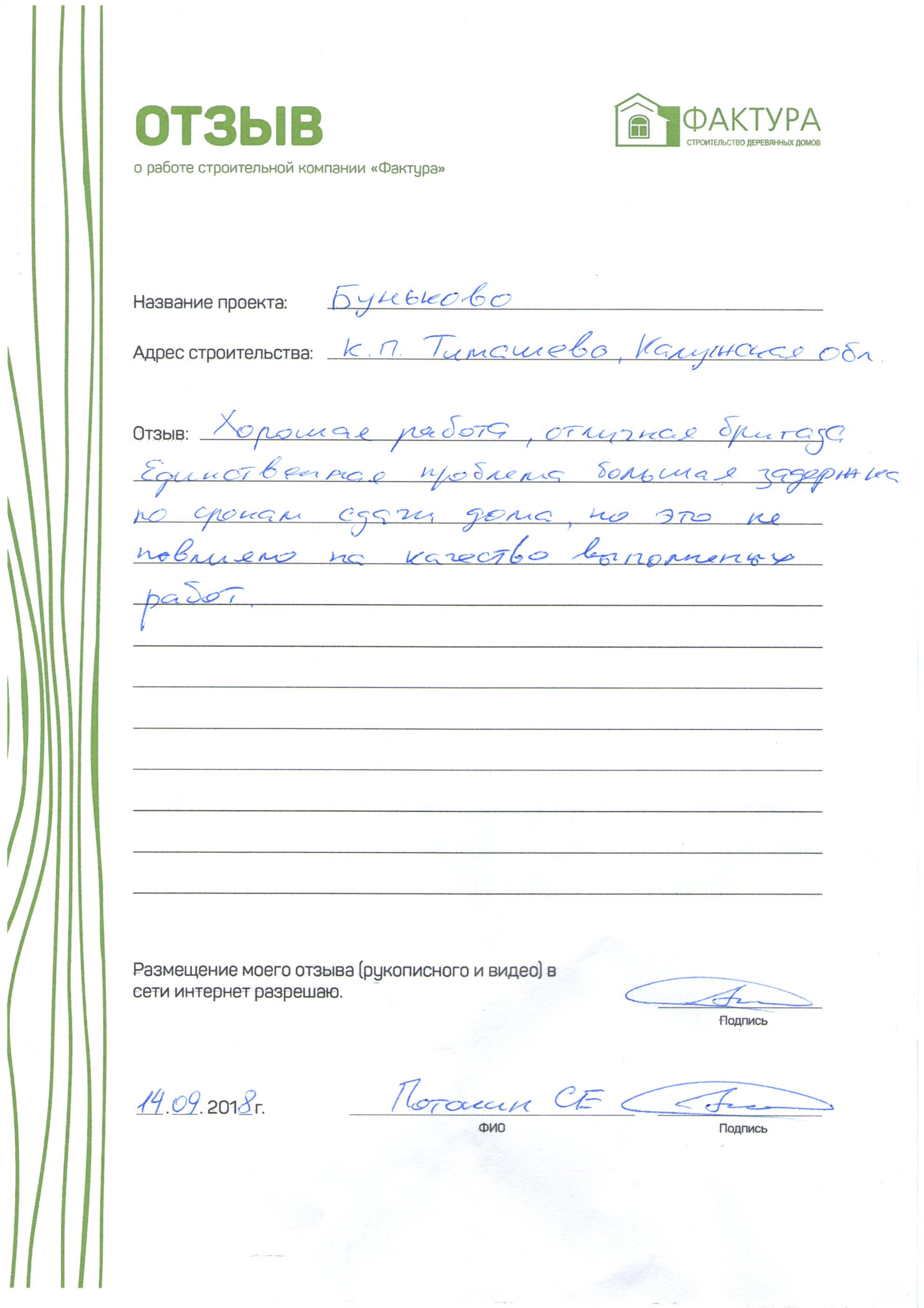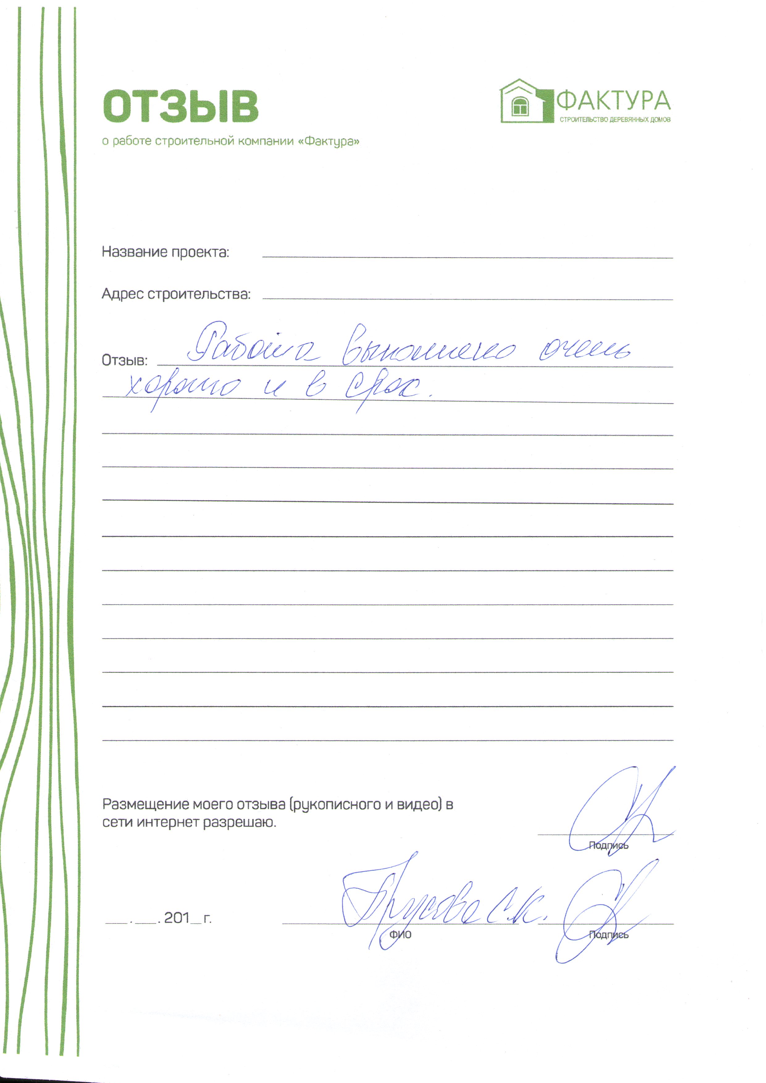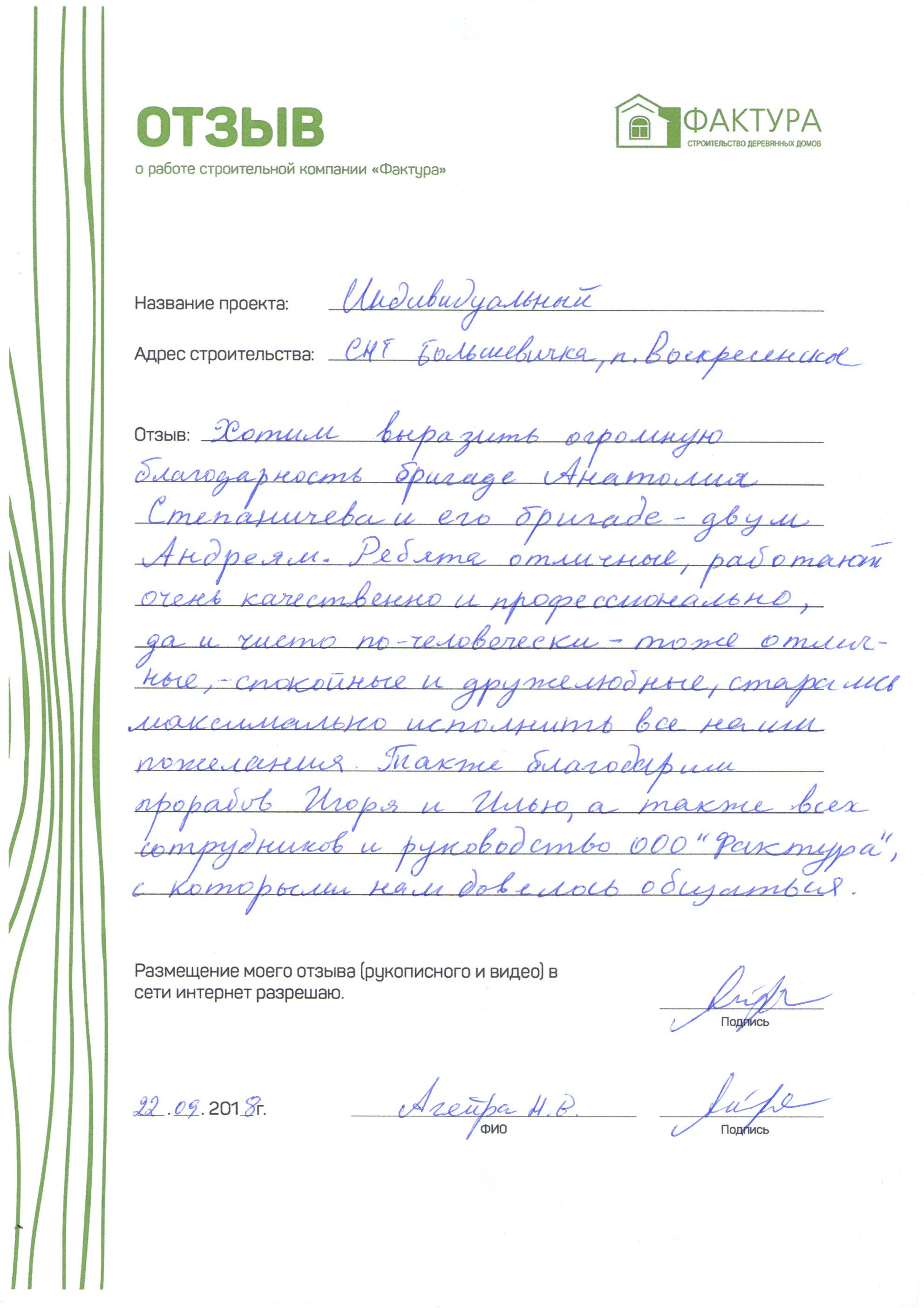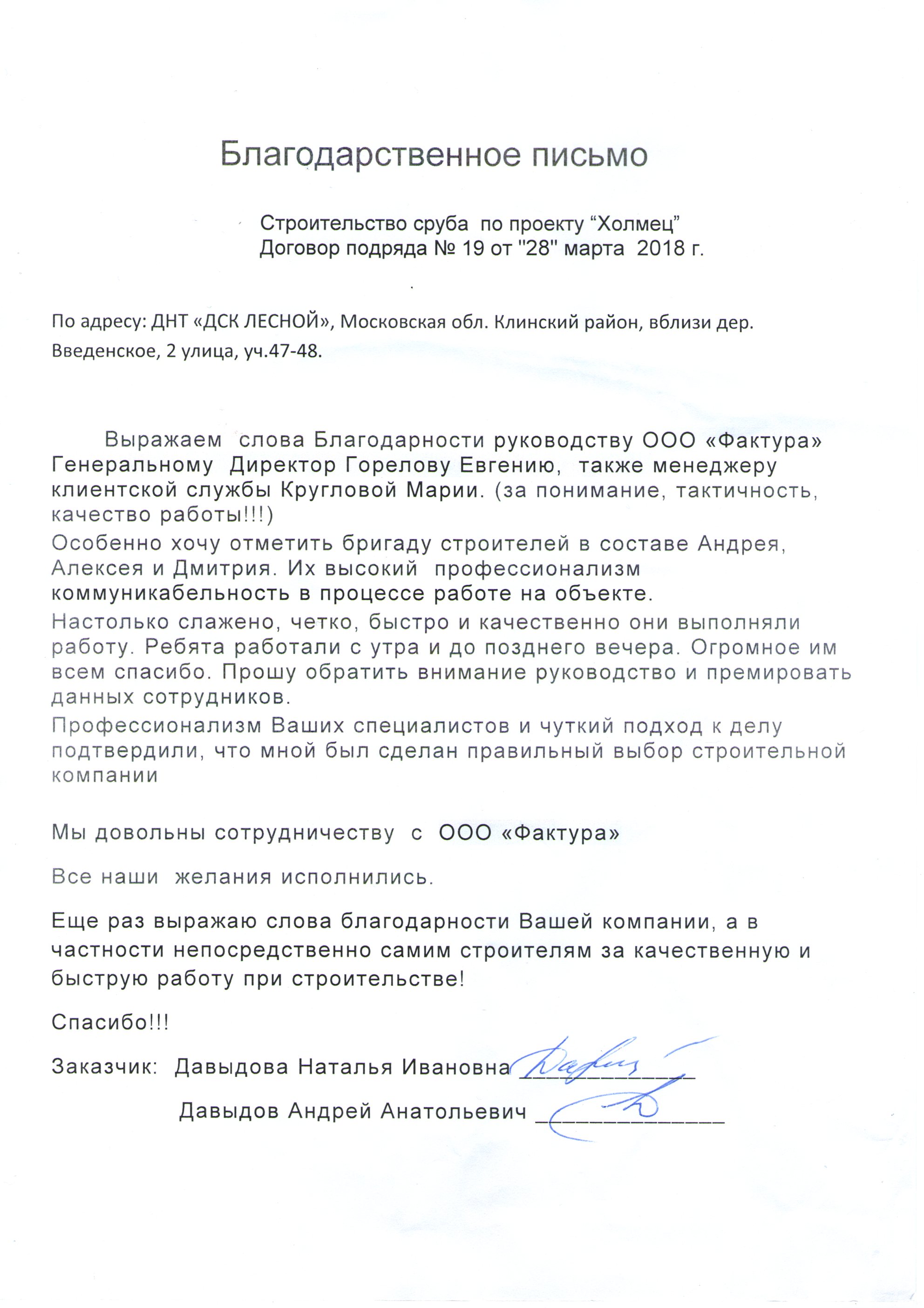 Выражаем слова благодарности руководству ООО "Фактура". Профессионализм ваших специалистов и чуткий подход к делу подтвердили, что мной был сделан правильный выбор строительной компании. Мы довольны сотрудничеству с ООО "Фактура". Все наши желания исполнились. Спасибо!!!