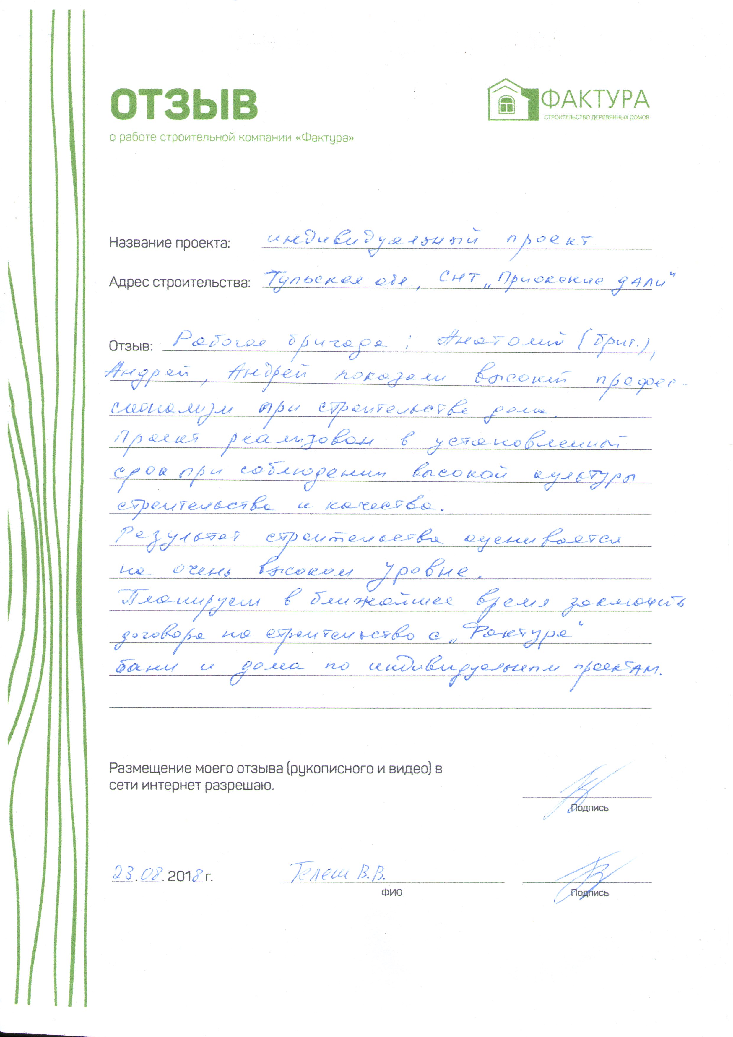 Хотим выразить огромную благодарность Анатолию Степановичу и его бригаде — двум Андреям. Ребята отличные, работают очень качественно и профессионально, да и сами спокойные и дружелюбные, старались исполнить все наши пожелания. Также благодарим прорабов Игоря и Илью, а заодно всех сотрудников и руководство ООО «Фактура», с которыми нам довелось общаться.