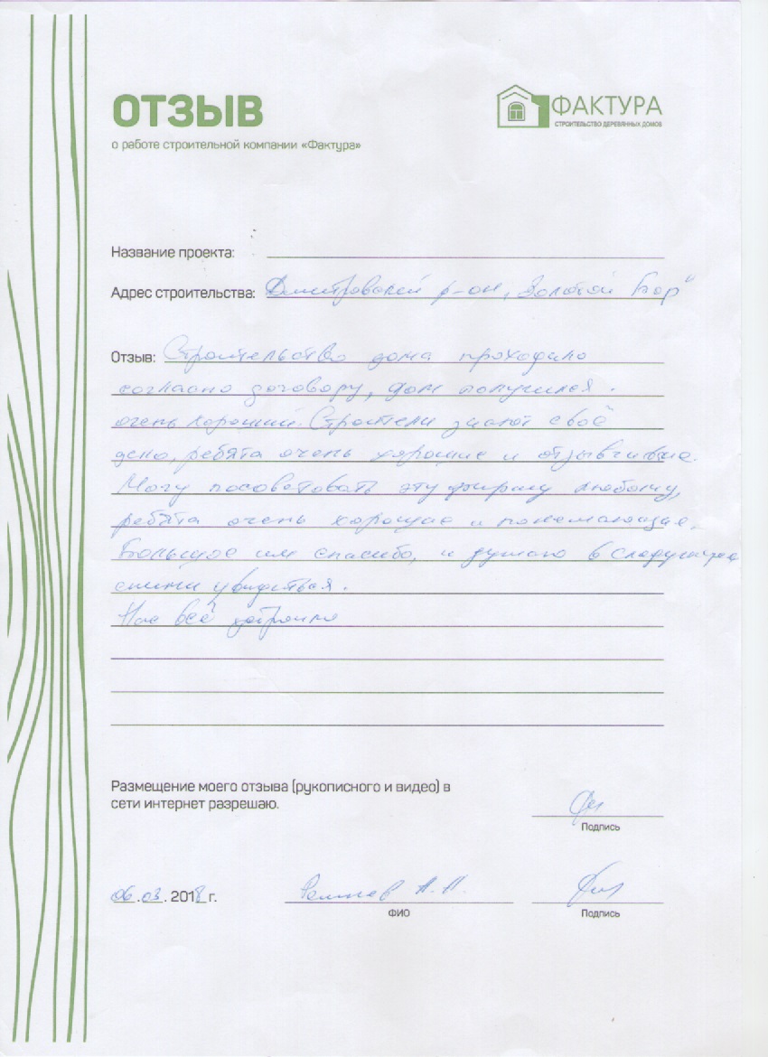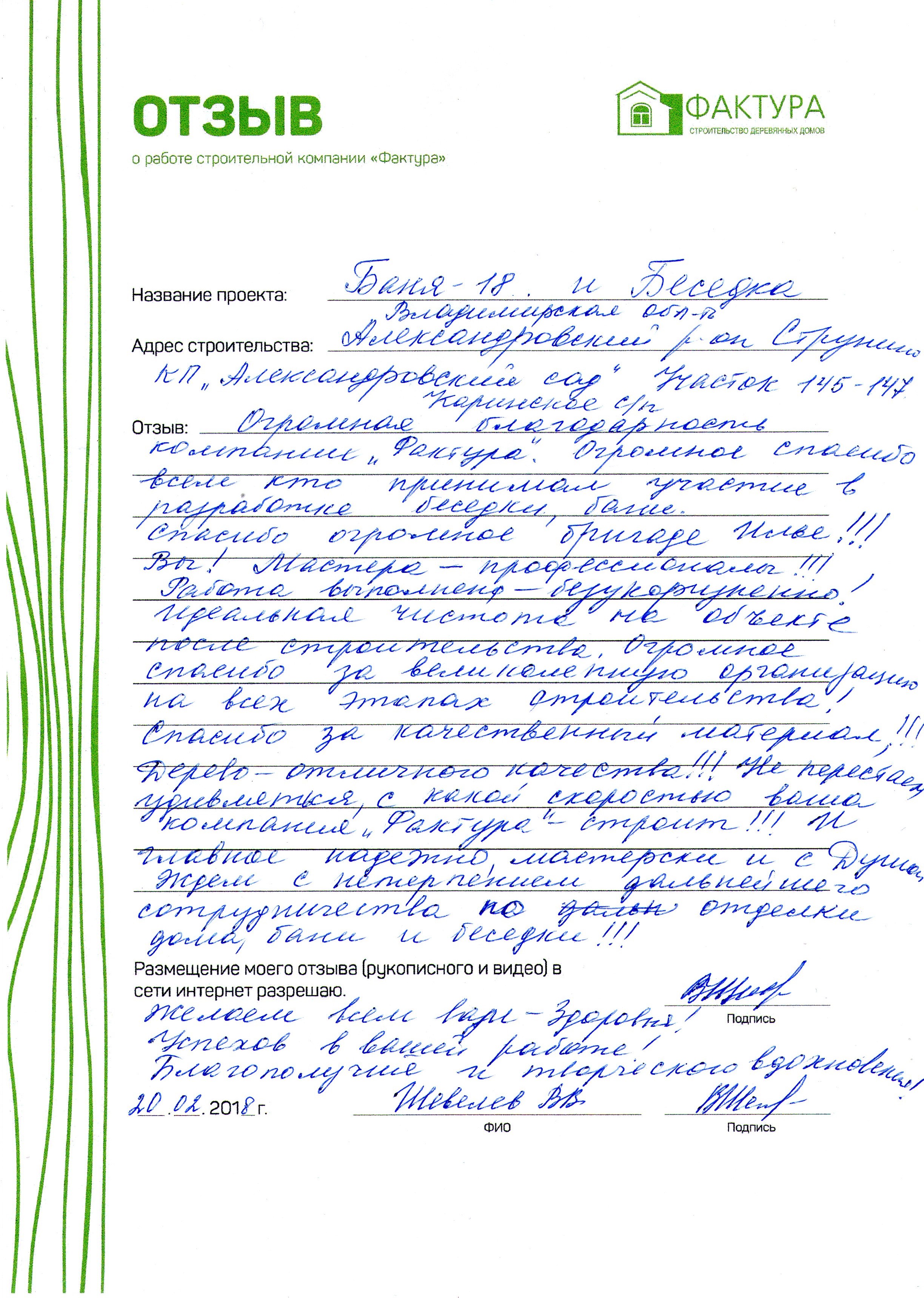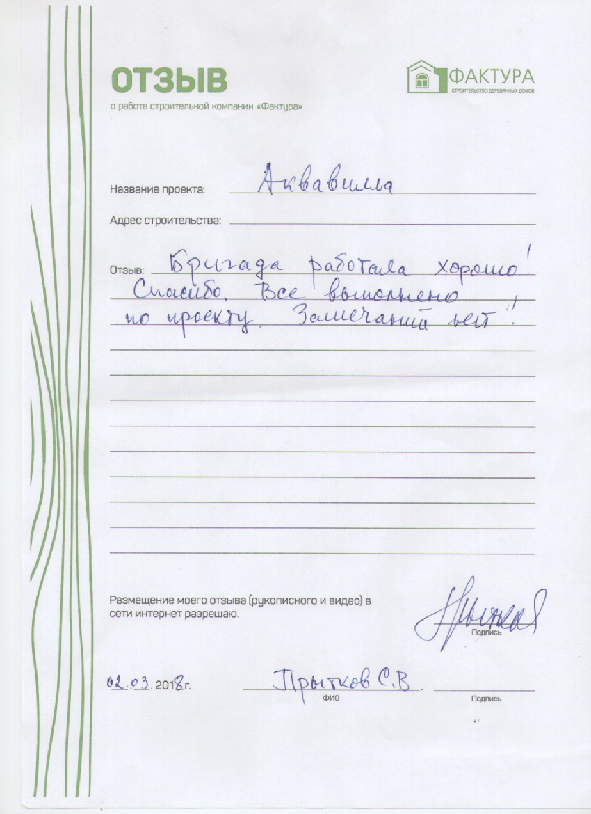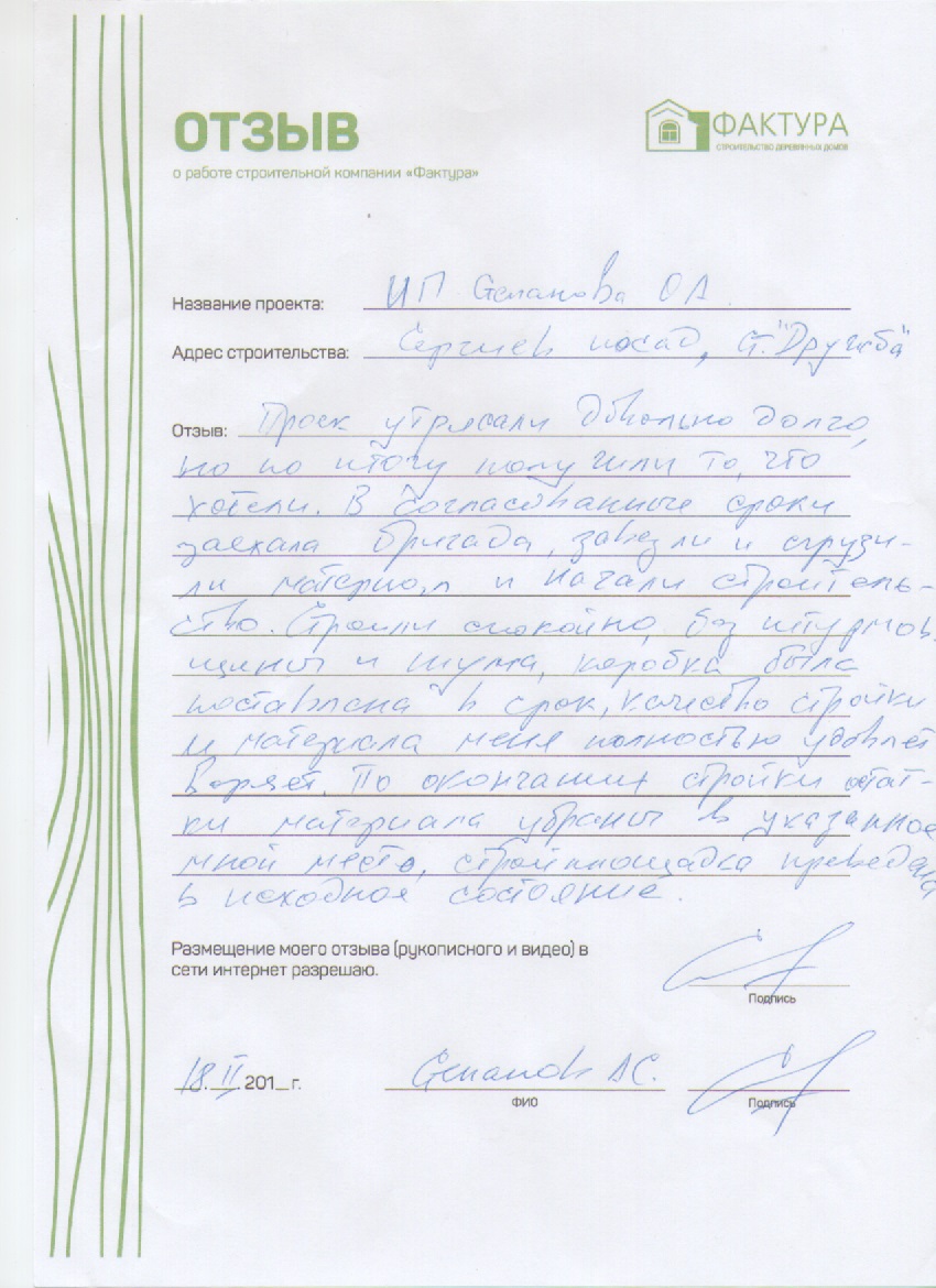 Огромная благодарность компании "Фактура". Вы мастера- профессионалы!!! Работа выполнена безукоризненно! Огромное спасибо за великолепную организацию на всех этапах строительства! Не перестаем удивляться, с какой скоростью ваша компания строит! И главное надежно, мастерски и с душой! Ждем с нетерпением дальнейшего сотрудничества по отделке дома, бани и беседки. Успехов в вашей работе! Благополучия и творческого вдохновения!