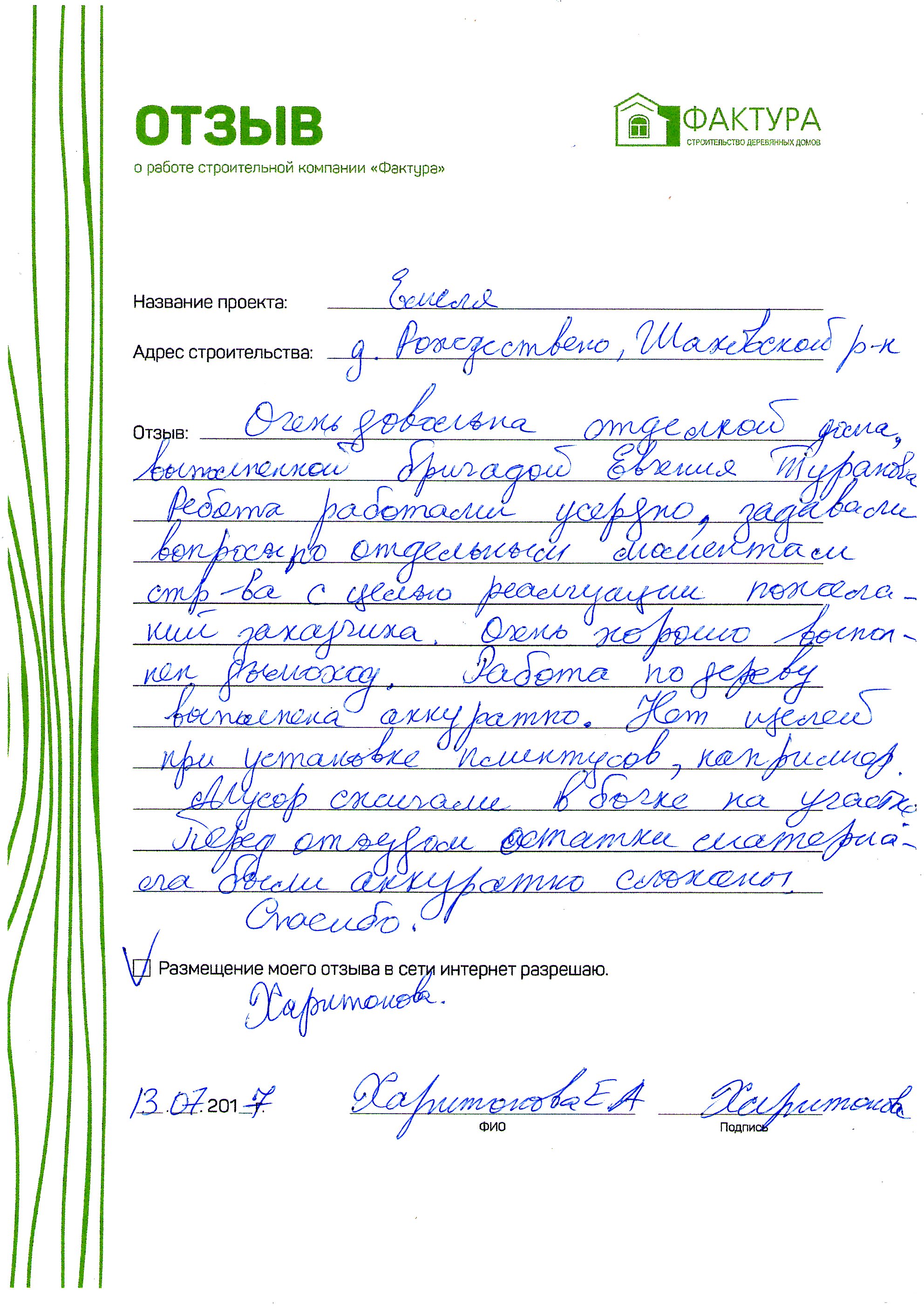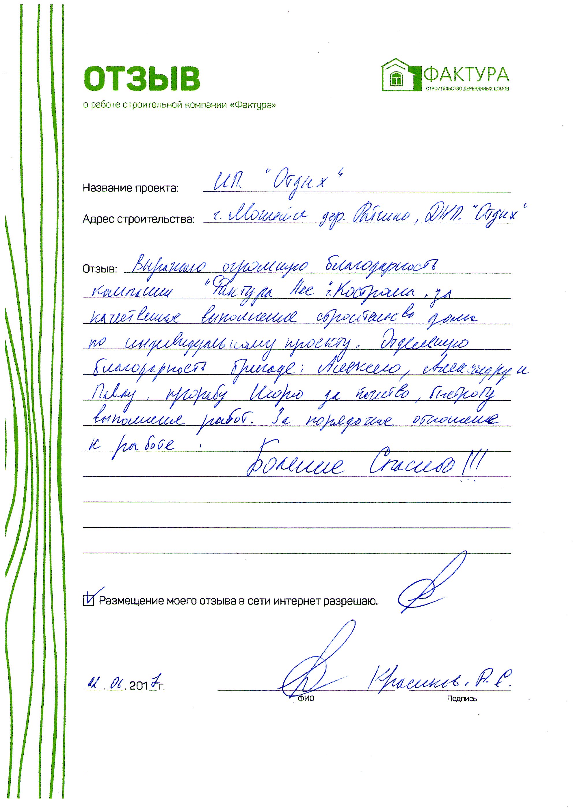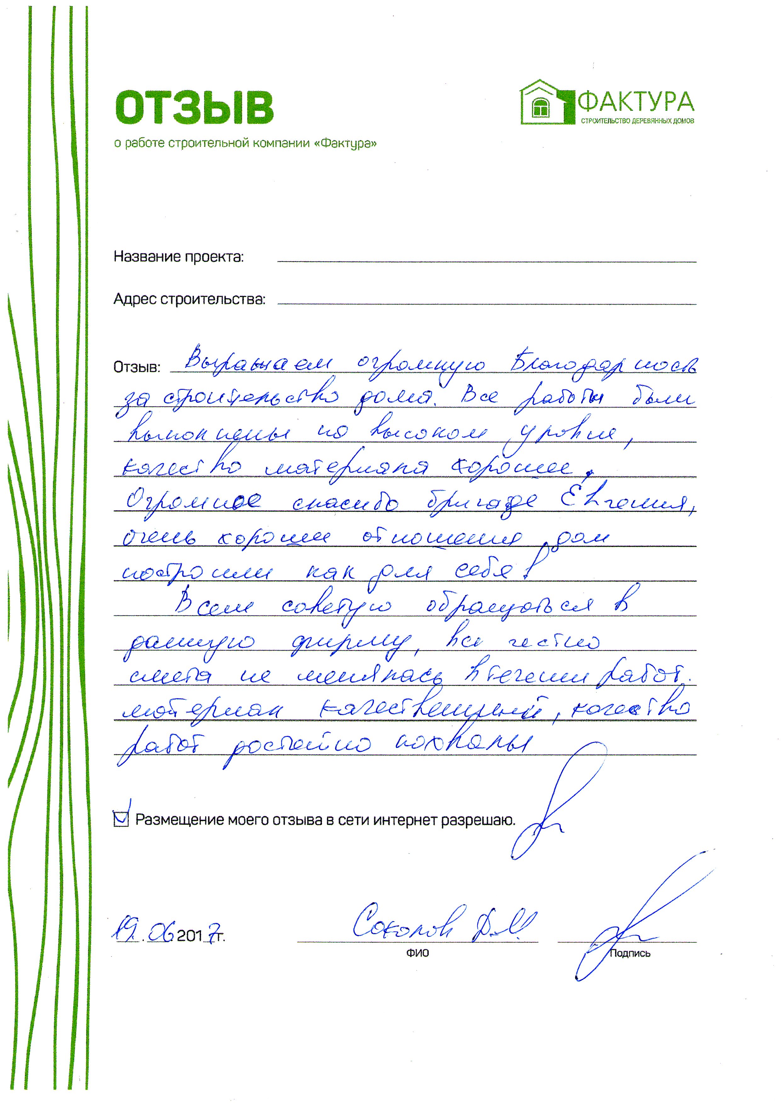 Выражаю огромную благодарность компании "Фактура Лес Кострома"за качественное выполнение строительства дома по индивидуальному проекту. Отдельную благодарность бригаде: Алексею, Александру и Павлу, прорабу Игорю за качество, быстроту выполнения работ. За порядочное отношение к работе. Большое спасибо!!!