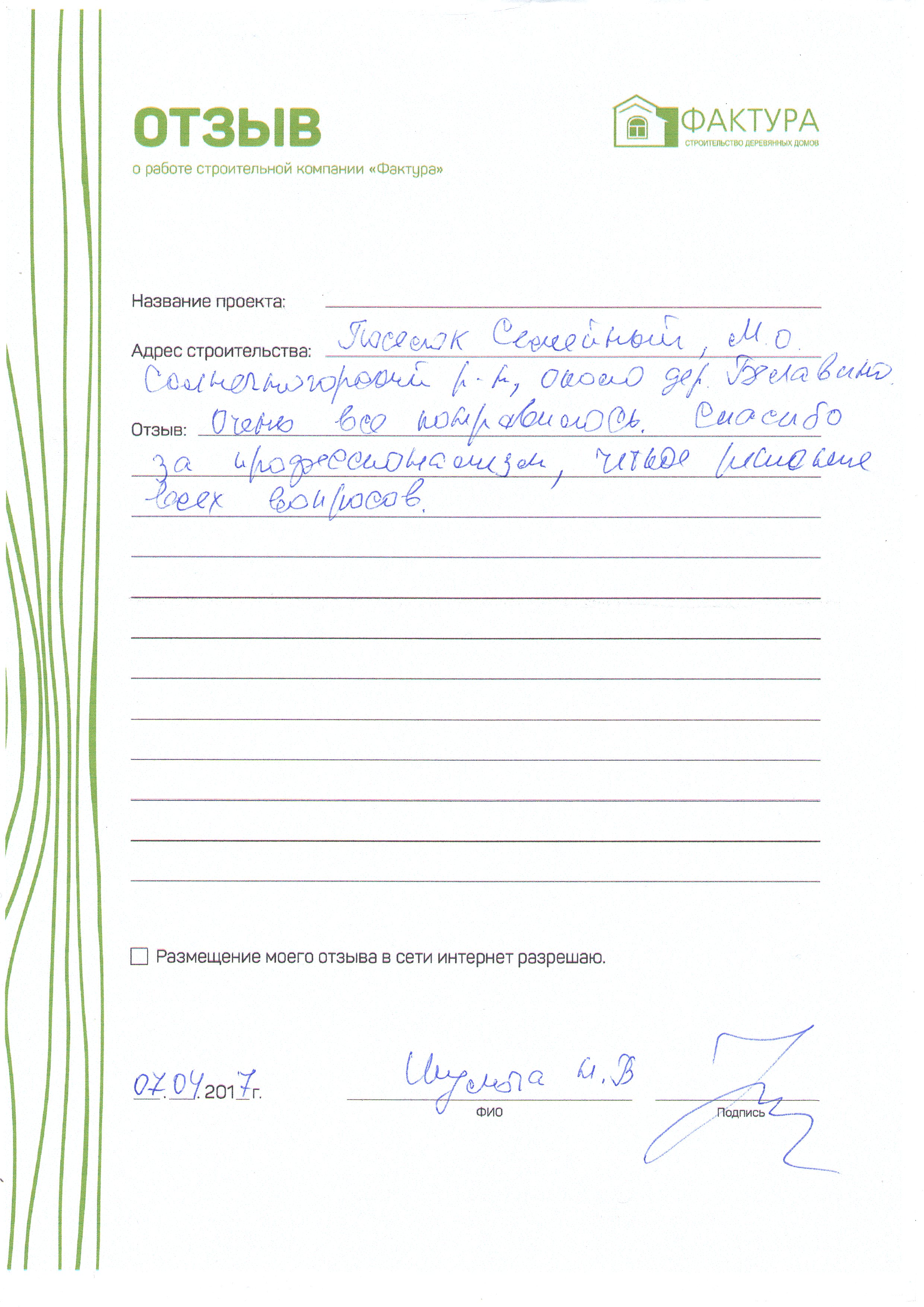 После общения с недобросовестными фирмами и имея печальный опыт, долго и скрупулезно искали фирму-подрядчика для строительства дома. Компания «Фактура» не подвела и оправдала наши ожидания. Цена не изменилась с момента подписания договора и до окончания стройки, а качество бревна, работа рабочих и окончательный результат- дом нам очень понравились, срыва сроков или каких-либо неожиданностей не было за все время. Довольны работой фирмы и будем рекомендовать ее друзьям!