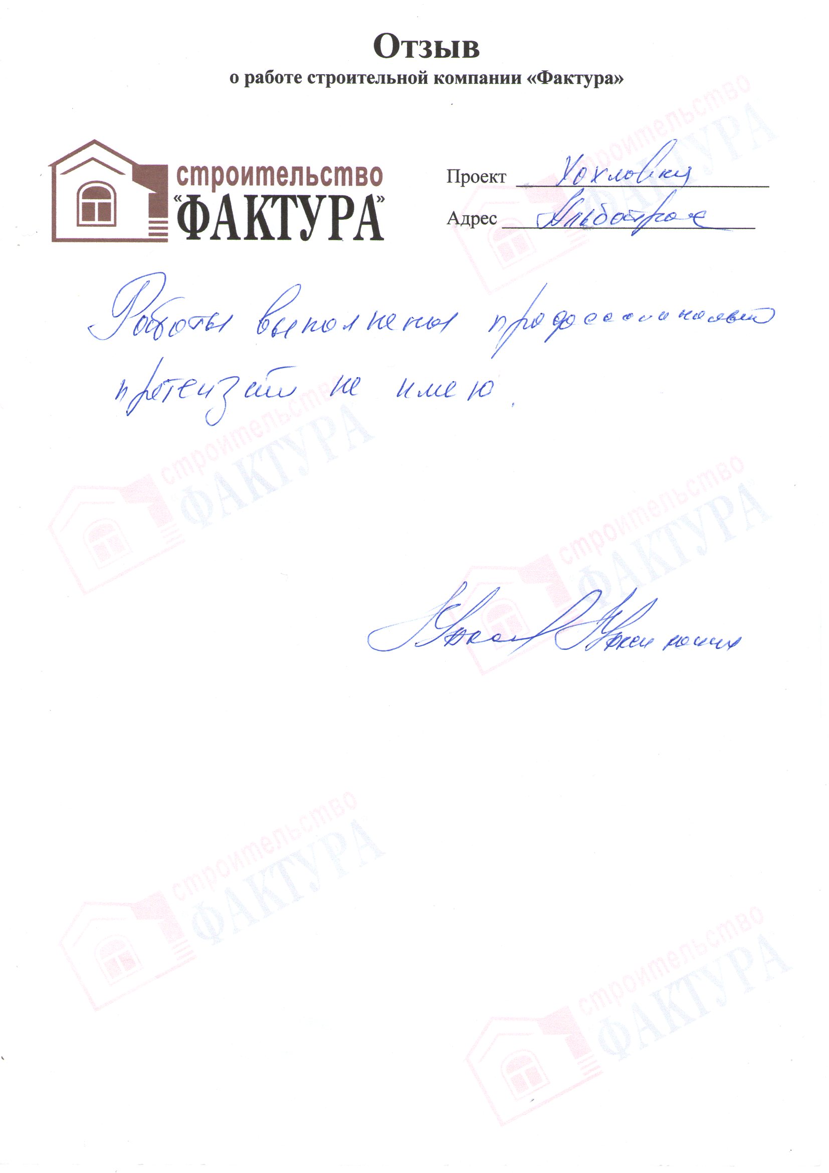 Хочу выразить благодарность бригаде Алексея Красногорского за хорошую, качественную, грамотную работу . Также хочется отметить менеджера Ольгу за умелую работу с клиентами. Спасибо компании "Фактура" за хороший дом и баню. Надеюсь, что отделка дома пройдёт успешно вместе с вами.