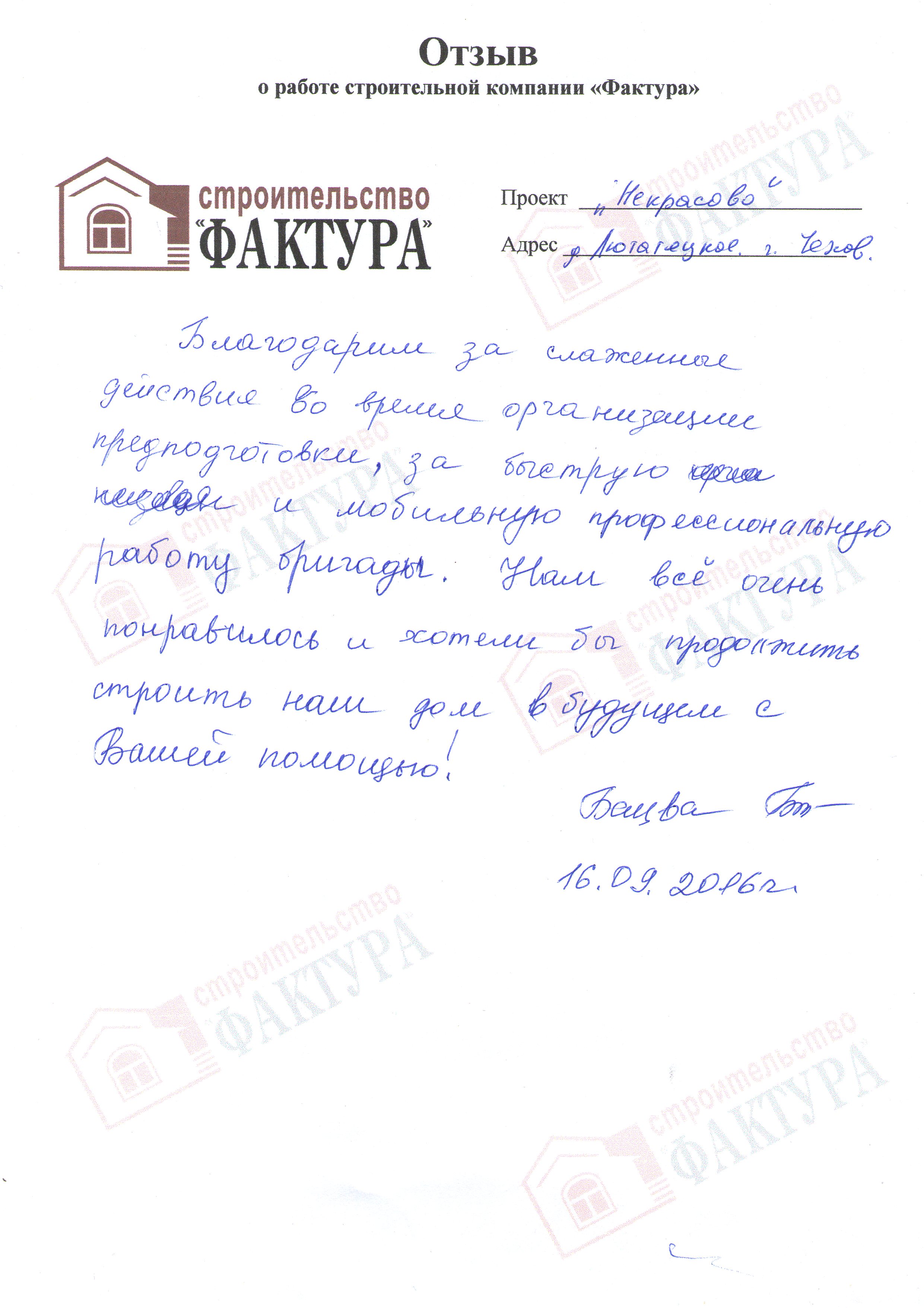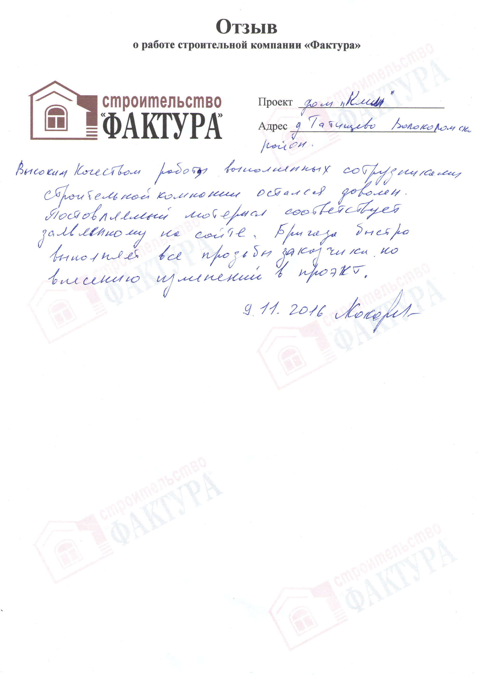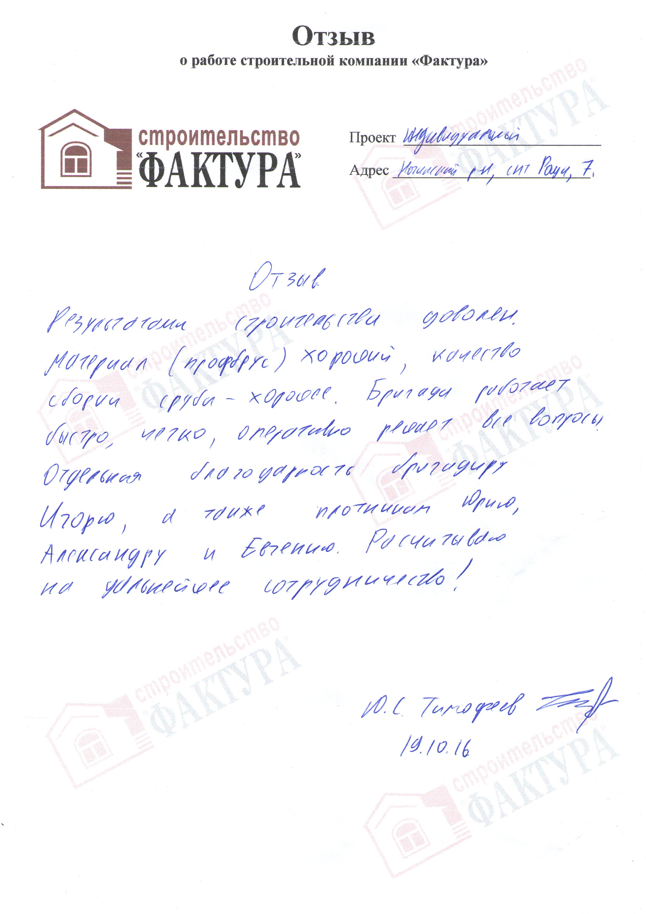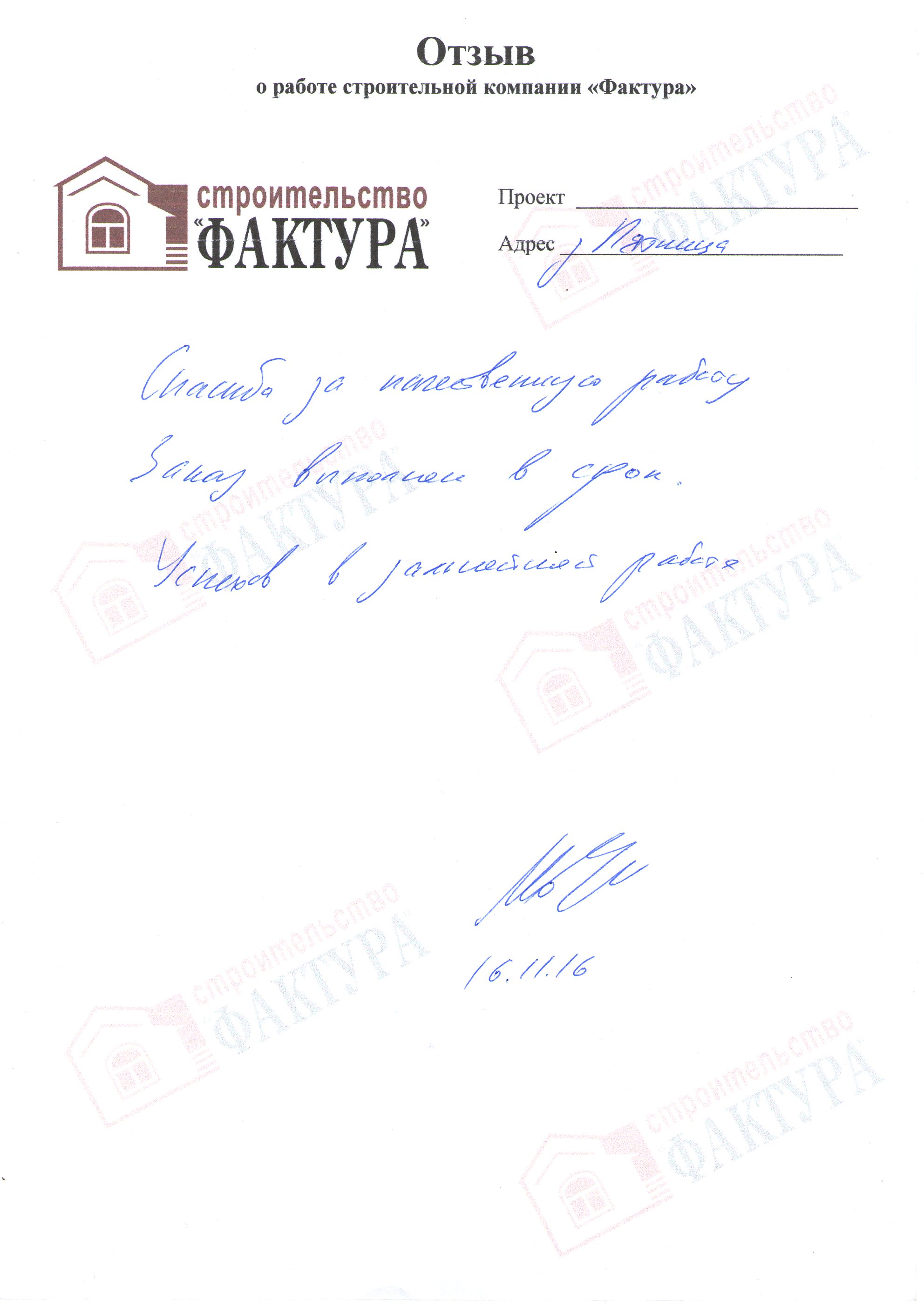 С компанией ООО"Фактура" мы начинали строительство первого этапа в 2015 г. и остались очень довольны. В этом году, решив начать внутреннюю отделку и изучив рынок отделочных работ, решили, что оптимальнее варианта нам не найти, тем более компания зарекомендовала себя на первом этапе очень хорошо. Как всегда соотношение цены и качества взяло верх. Работы продолжались 3,5 месяца, за это время бригада строителей произвела отделку дома под ключ, включая внешнюю покраску дома, утепление перекрытий, прокладку электро разводки по дому и изготовление лестницы на 2 этаж, которая производит впечатление на всех гостей и соседей. Качеством работ мы очень довольны. Бригада строителей качественно и ответственно выполняли свою работу, и вот по прошествии почти 3 месяцев мы не можем придраться ни к одному виду работ. Надеемся, что после зимовки дома у нас так же не будет вопросов ) В процессе отделки ребята учитывали все наши замечания и пожелания. Отдельное спасибо хочется сказать бригадиру на участке Сергею, который всегда был на связи и выполнял наши просьбы даже те, которые, иногда, напрямую к отделке не имели отношения. Так же хочется поблагодарить Директора компании Горелова Евгения и Производственного директора Андрея за профессионализм и клиентоориентированность. Желаем компании ООО "Факутра" процветания и успехов.