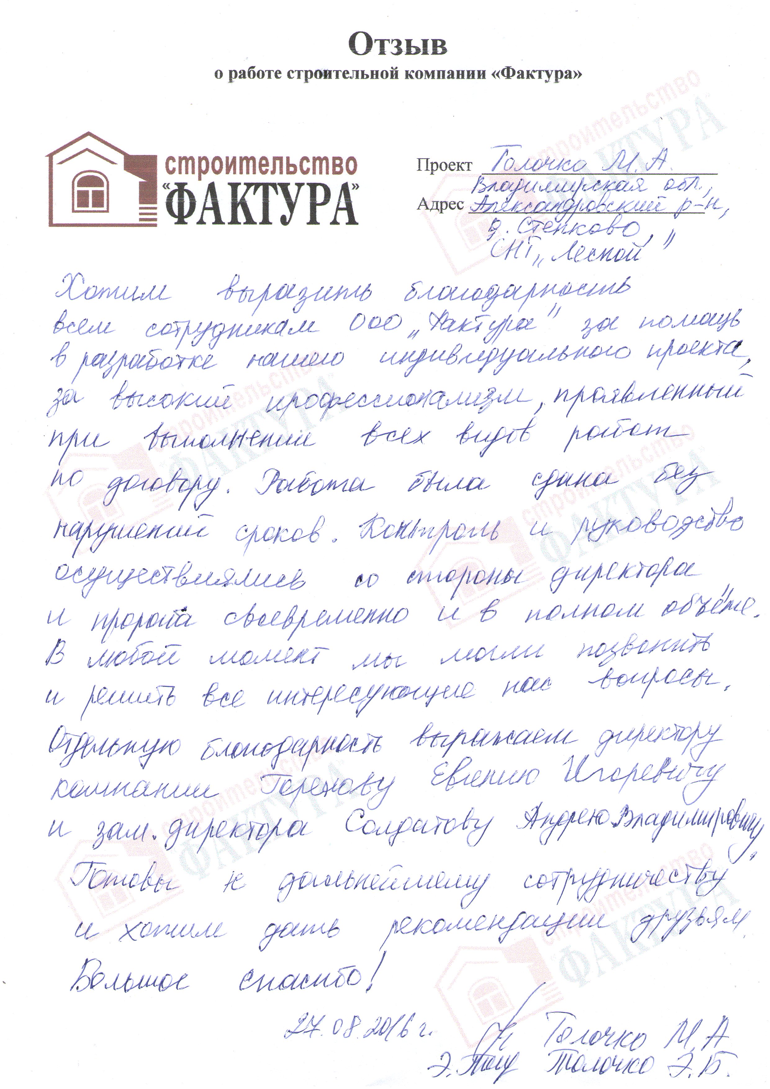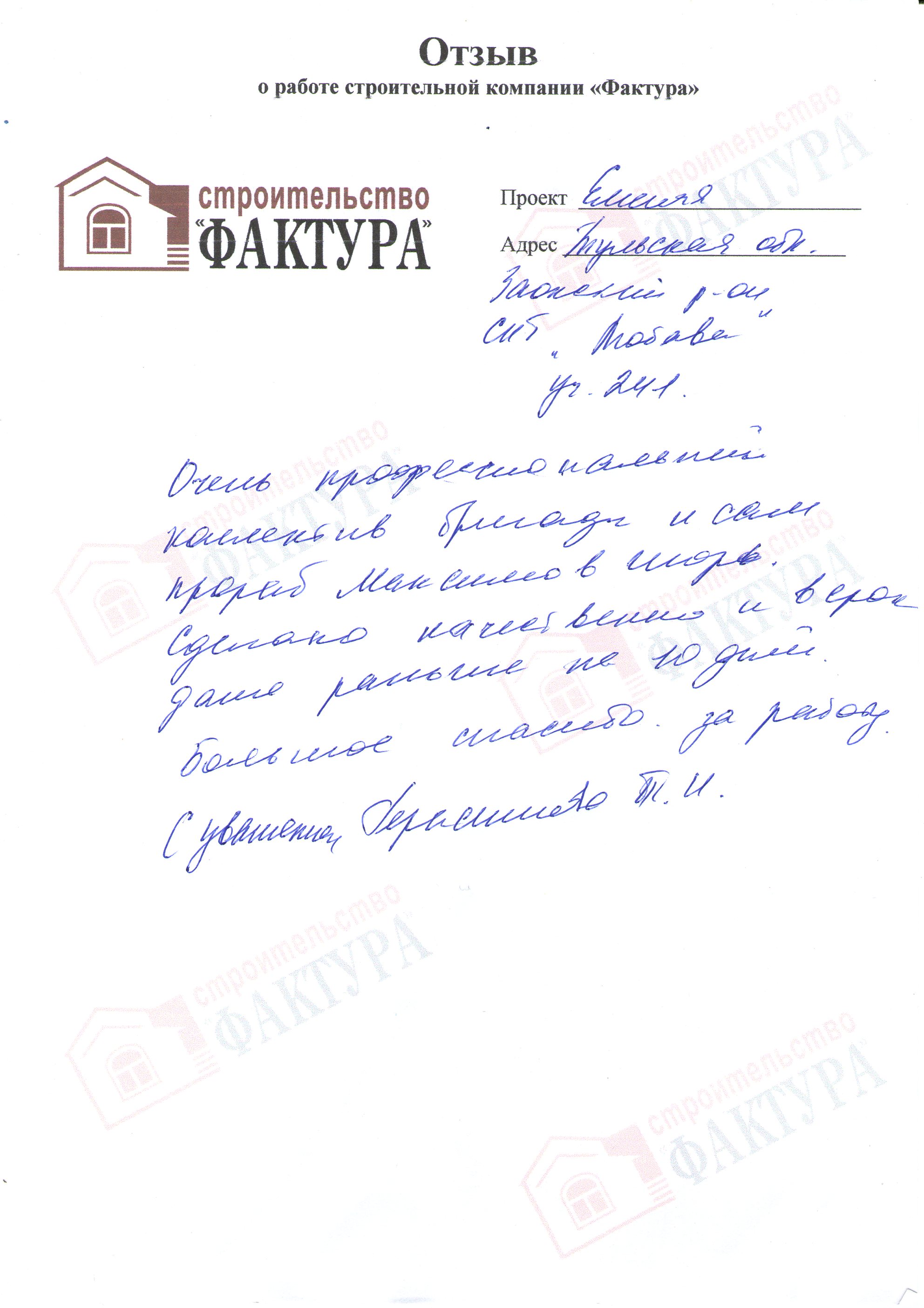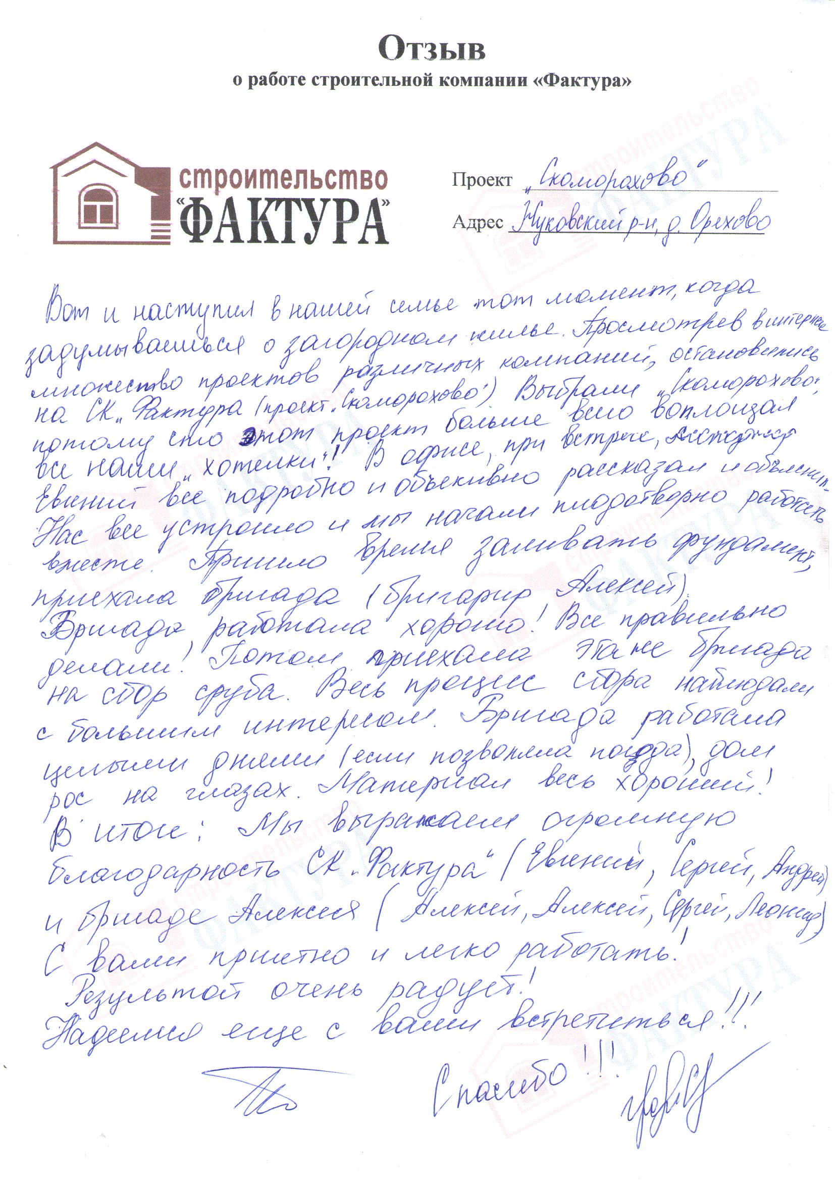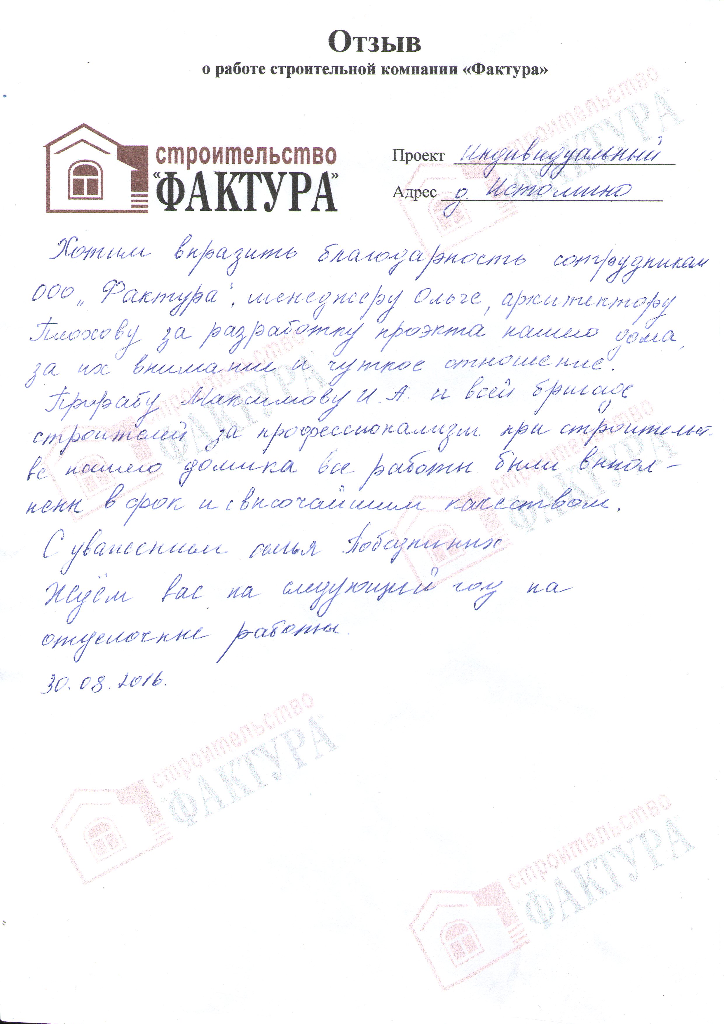 Хотим выразить благодарность сотрудникам ООО «Фактура»: менеджеру Ольге, архитектору Плохову за разработку проекта нашего дома, за их внимание и чуткое отношение. Прорабу Максимову И.А. и всей бригаде строителей за профессионализм при строительстве нашего домика, все работы были выполнены в срок и с высочайшим качеством. Ждем вас на следующий год на отделочные работы.