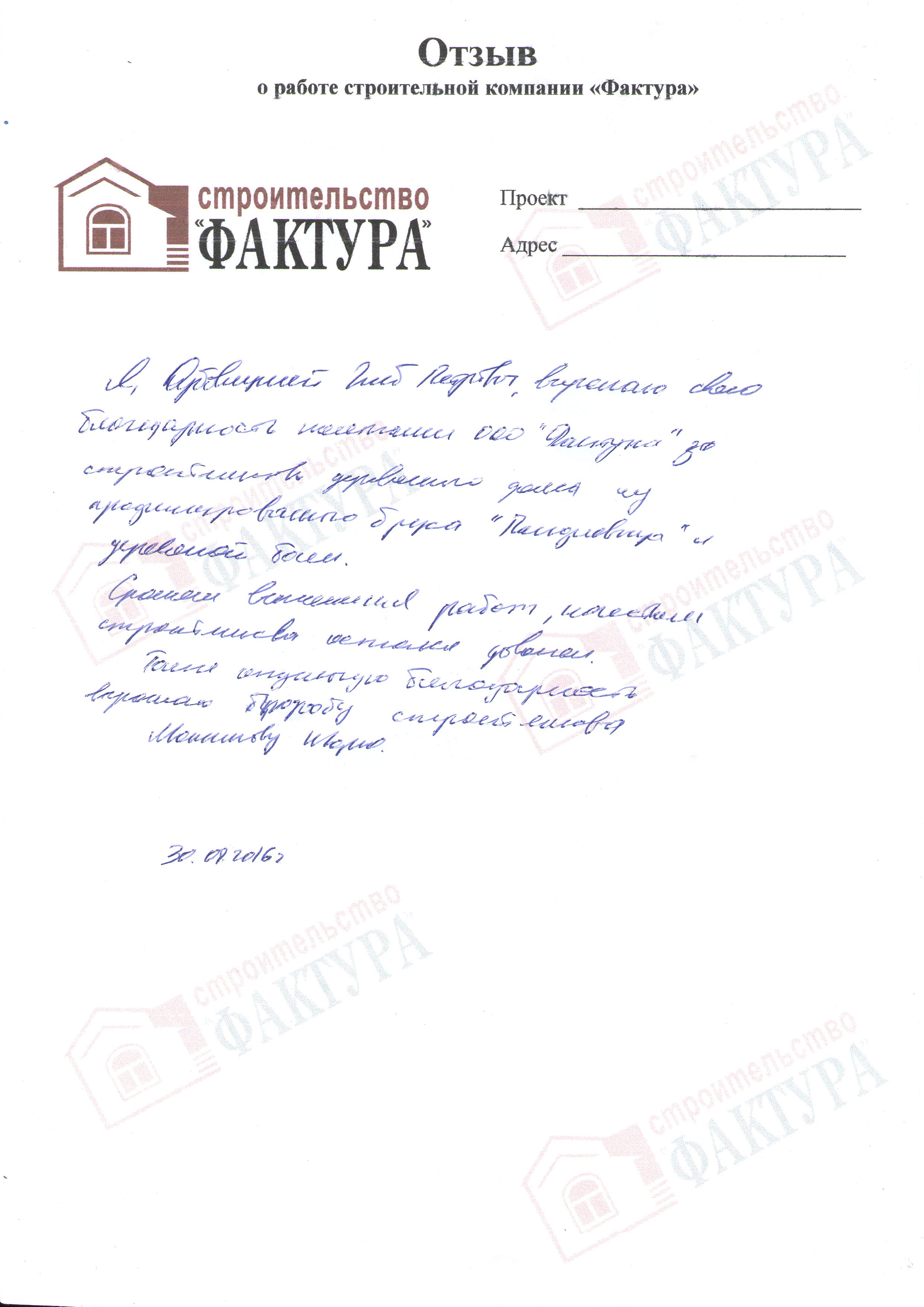 Хотим выразить благодарность всем сотрудникам ООО «Фактура» за помощь в разработке нашего индивидуального проекта, за высокий профессионализм, проявленный при выполнении всех видов работ по договору. Работа была сдана без нарушений сроков. Контроль и руководство осуществлялись со стороны директора и прораба своевременно и в полном объёме. В любой момент мы могли позвонить и решить все интересующие нас вопросы. Отдельную благодарность выражаем директору компании Горелову Евгению Игоревичу и зам.директора Солдатову Андрею Владимировичу. Готовы к дальнейшему сотрудничеству и хотим дать рекомендации друзьям. Большое спасибо!