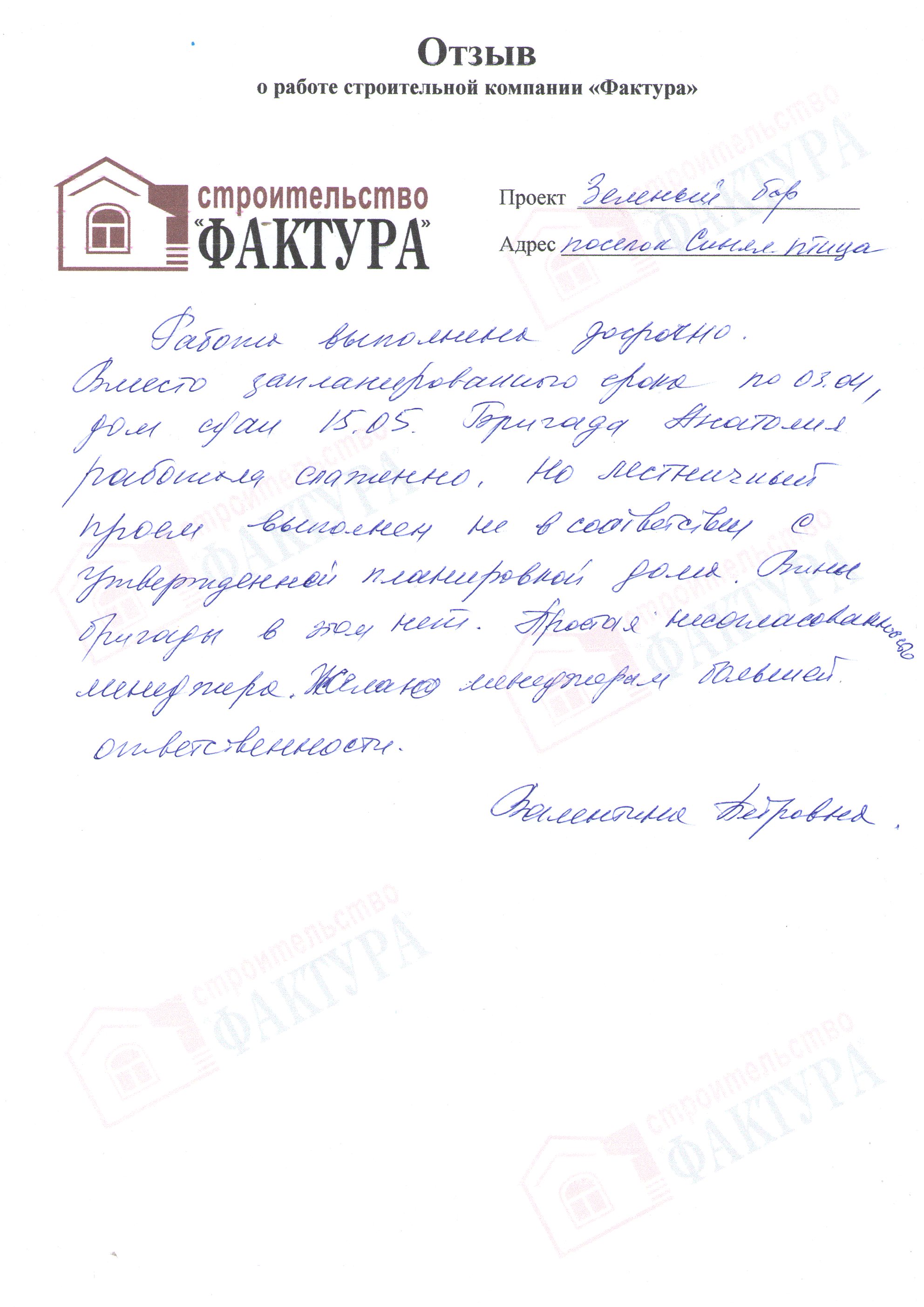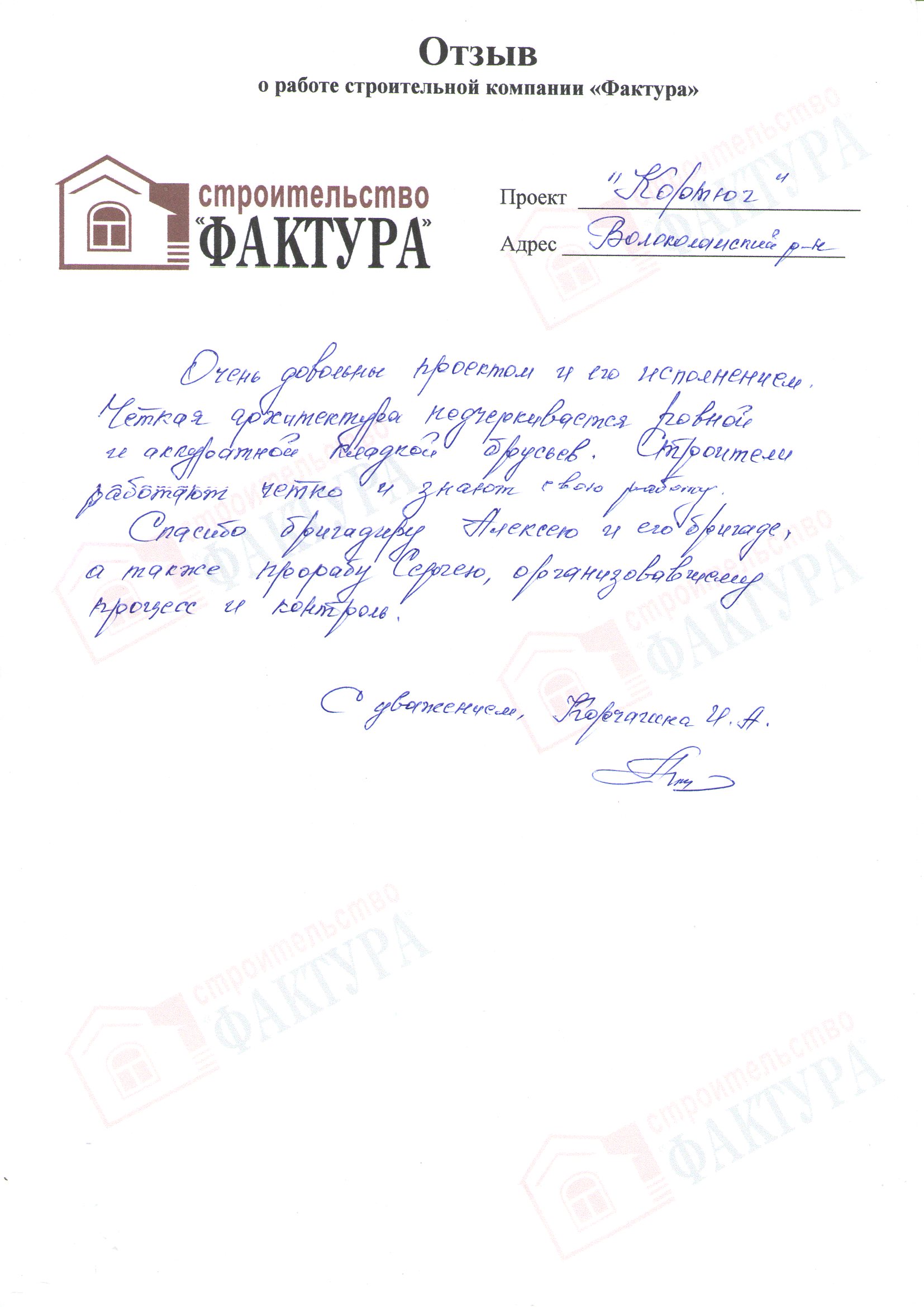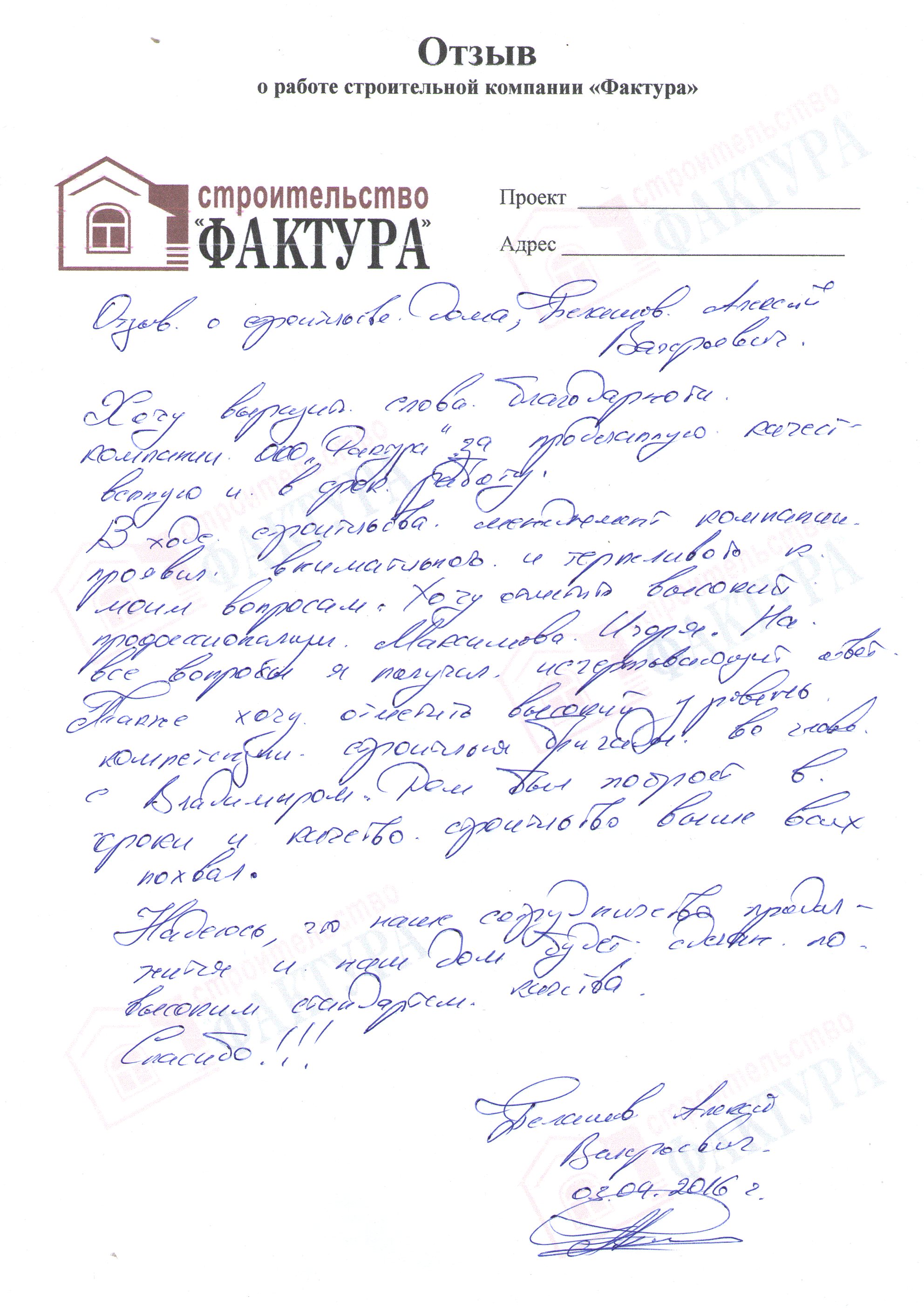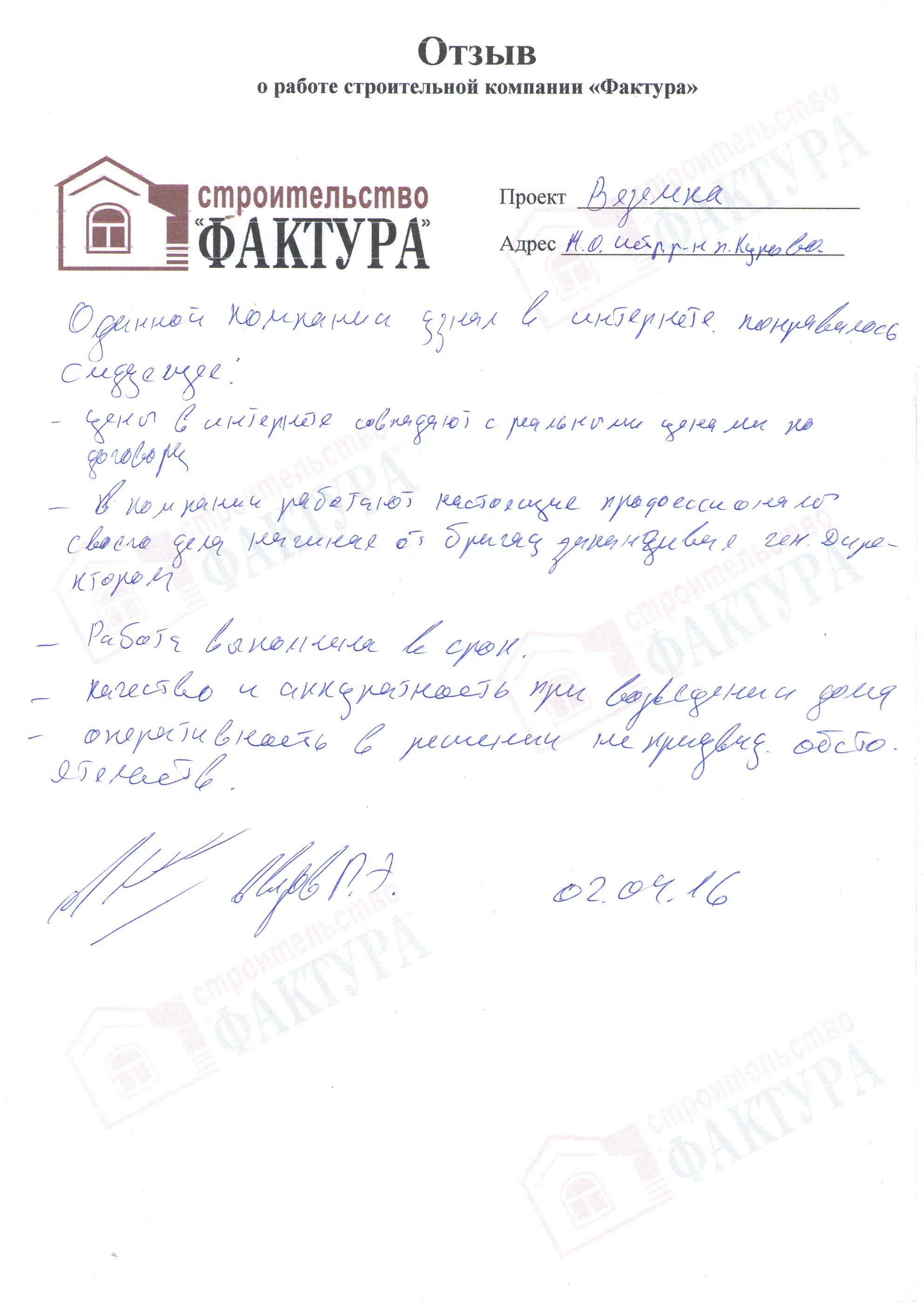 Хочу выразить слова благодарности компании ООО «Фактура» за проделанную качественную и в срок работу.