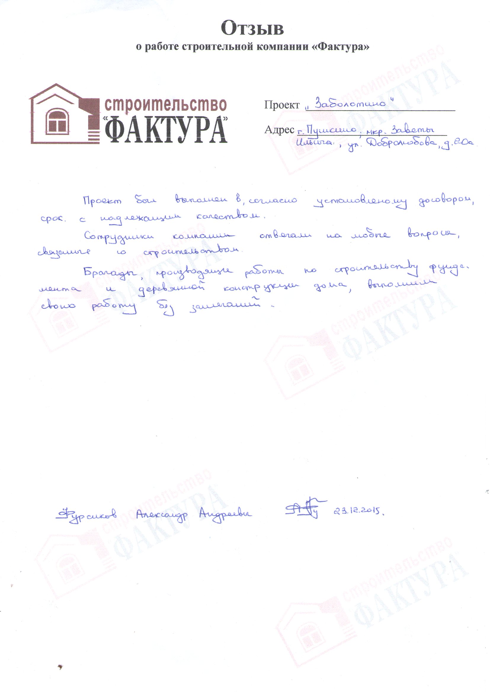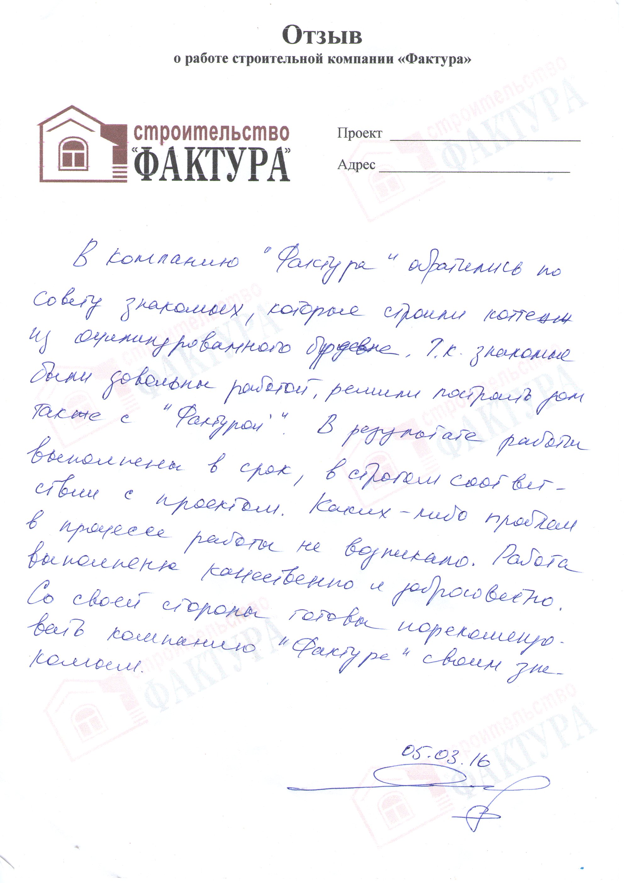 В компанию «Фактура» обратились по совету знакомых, которые строили коттедж из оцилиндрованного бревна. Т.к. знакомые были довольны работой, решили построить дом также с «Фактурой». В результате работы выполнены в срок, в строгом соответствии с проектом. Каких- либо проблем в процессе работы не возникало. Работа выполнена качественно и добросовестно. Со своей стороны готовы порекомендовать компанию «Фактура» своим знакомым.