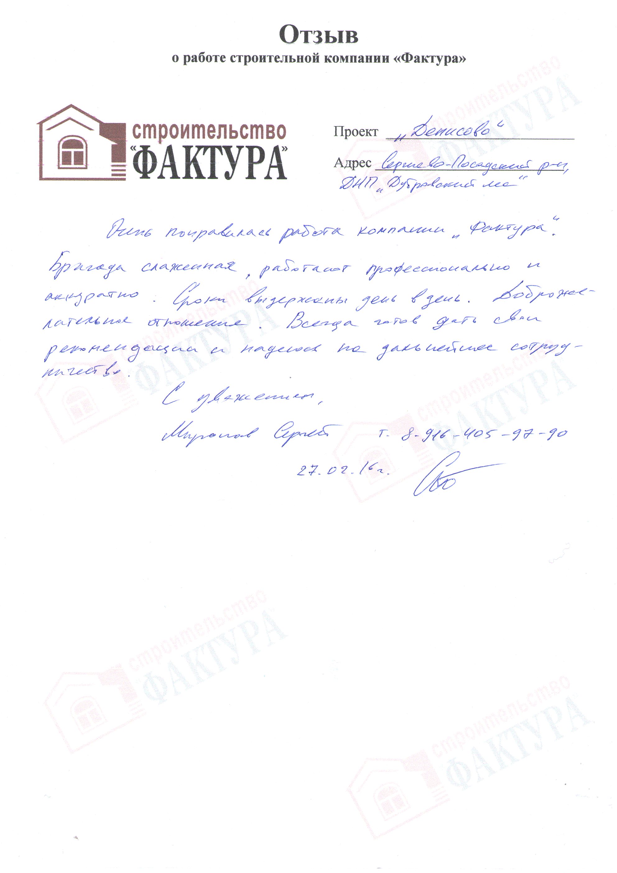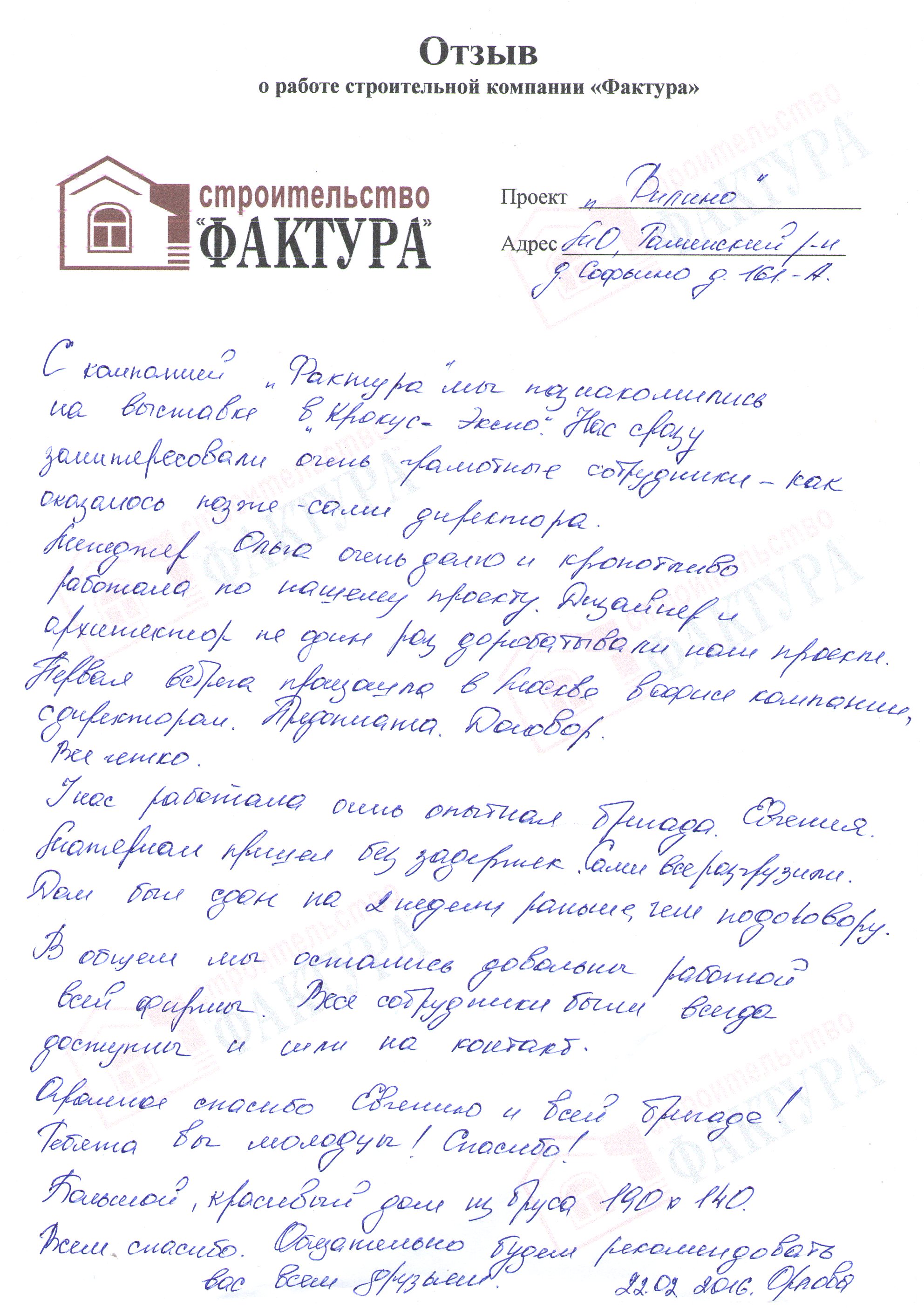 С компанией «Фактура» мы познакомились на выставке в «Крокус Экспо». Нас сразу заинтересовали очень грамотные сотрудники- как оказалось позже- сами директора. Менеджер Ольга очень долго и кропотливо работала по нашему проекту. Дизайнер и архитектор не один раз дорабатывали наш проект. Первая встреча произошла в Москве в офисе компании, с директором. Предоплата. Договор. Все четко. У нас работала очень опытная бригада Евгения. Материал пришел без задержек. Сами все разгрузили. Дом был сдан на 2 недели раньше, чем по договору. В общем, мы остались довольны работой всей фирмы. Все сотрудники были всегда доступны и шли на контакт.