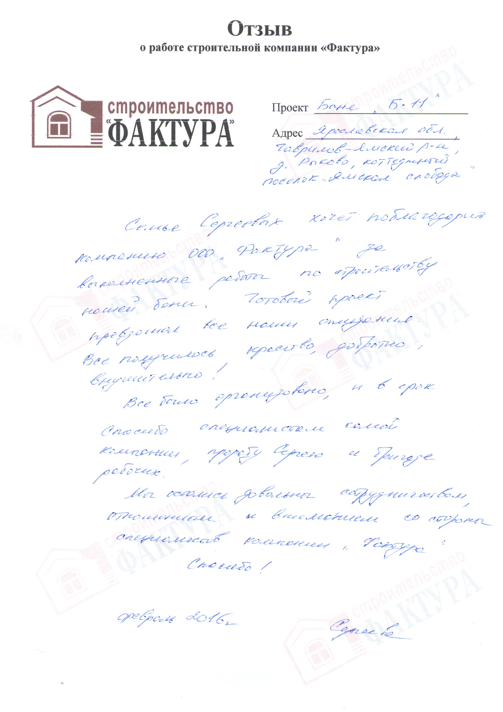 Семья Сергеевых хочет поблагодарить компанию ООО «Фактура» за выполненные работы по строительству нашей бани. Готовый проект превзошел все наши ожидания. Все получилось красиво, добротно, внушительно!