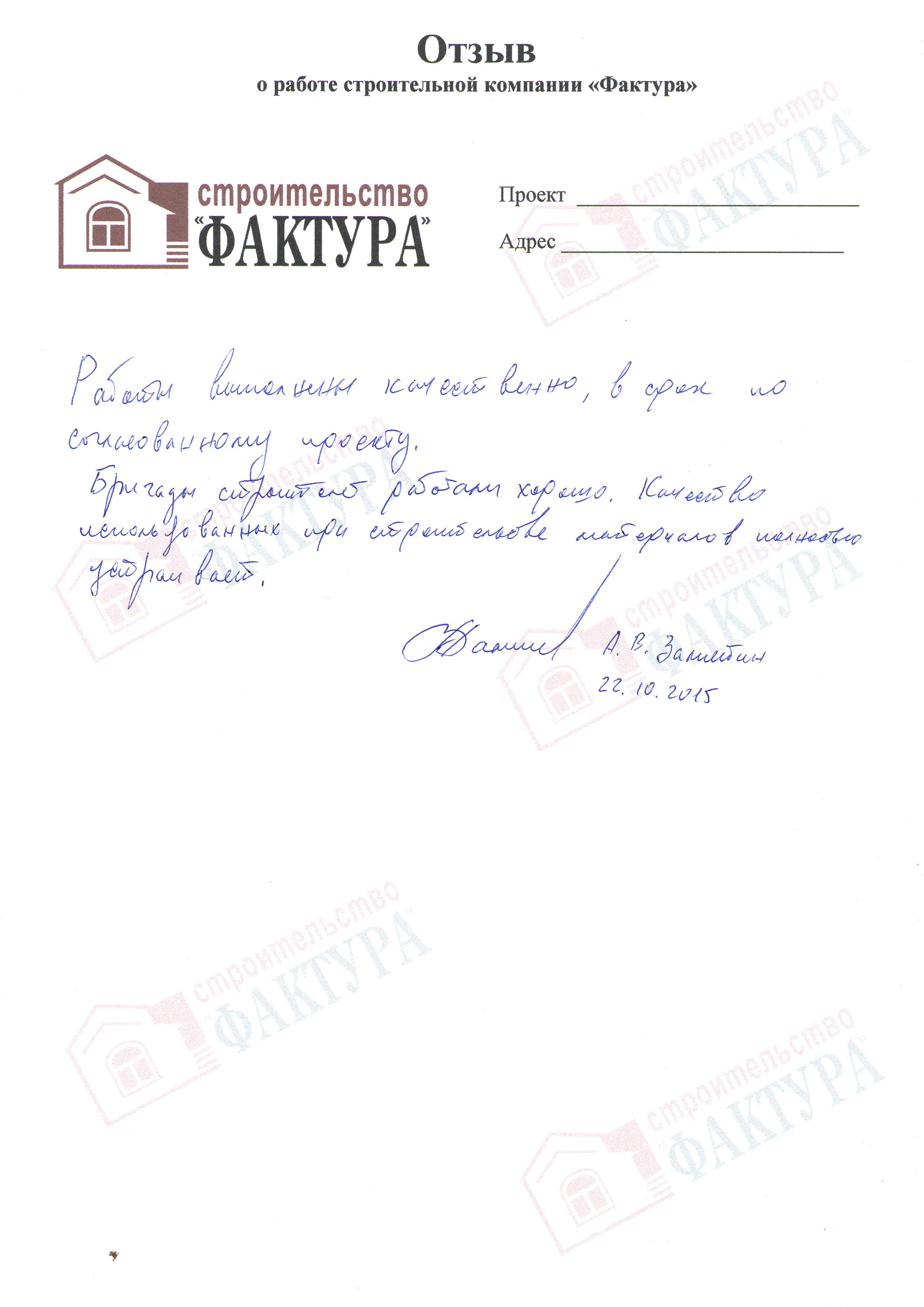 После усадки дома мы планируем вновь обратиться в фирму «Фактура», к бригаде Алексея для выполнения работ по отделке. Рекомендуем компанию «Фактура» всем, кто ещё не определился с выбором подрядчика. Надежная и честная строительная фирма. 22 октября 2015 г.