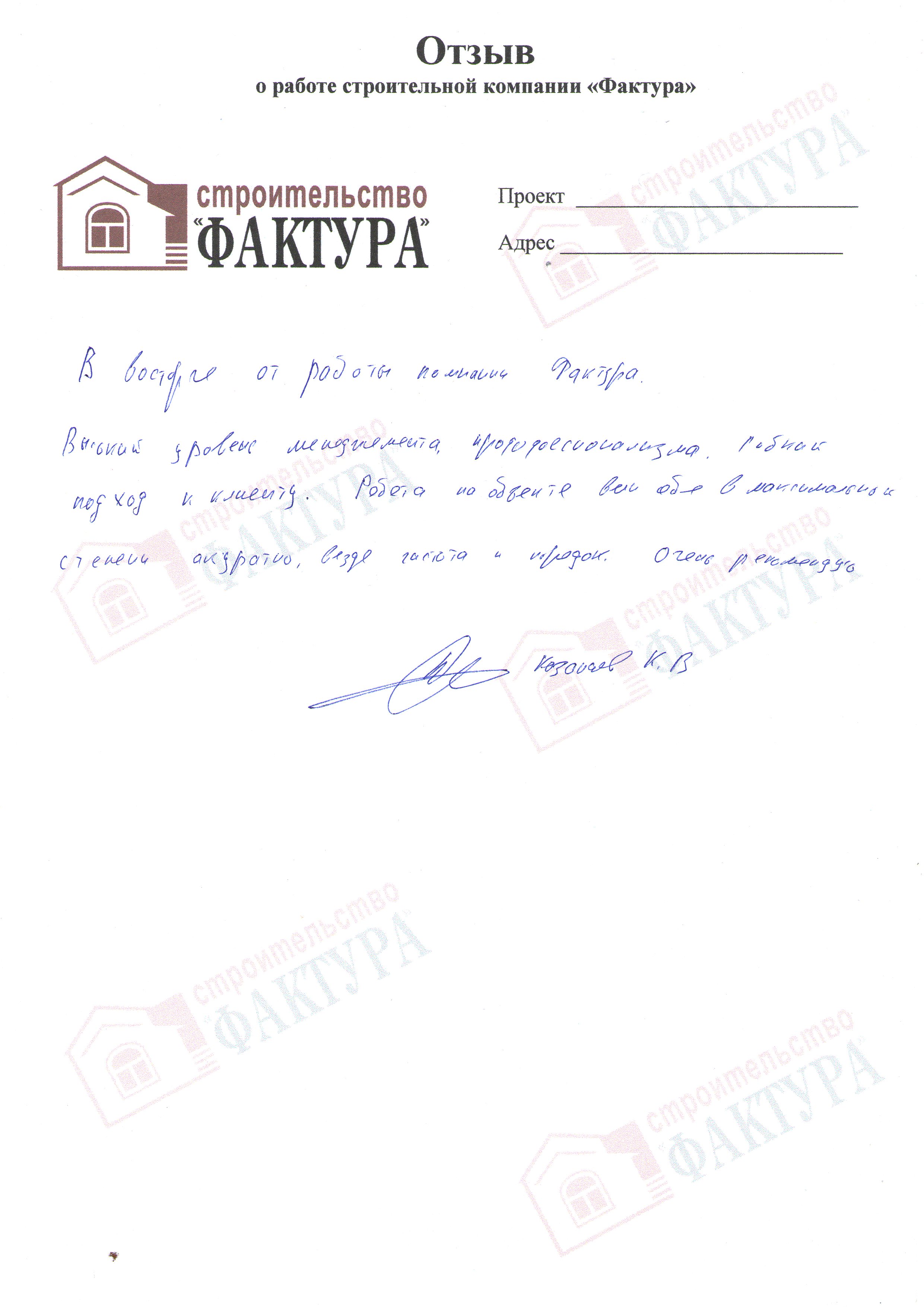 Выражаем огромную благодарность строительной компании «Фактура». Строительство нашего дома было закончено в срок, никаких претензий во время работы бригады не возникало. Отделка внутри дома, включая окна, лестницу и двери безупречна. Отдельно хотелось бы поблагодарить нашу бригаду Сергея, Николая и всех остальных ребят, а также руководство компании Андрея и Евгения, которые незамедлительно, в любое время решали все наши вопросы. Обязательно будем рекомендовать данную компанию друзьям и знакомым. Большое спасибо.