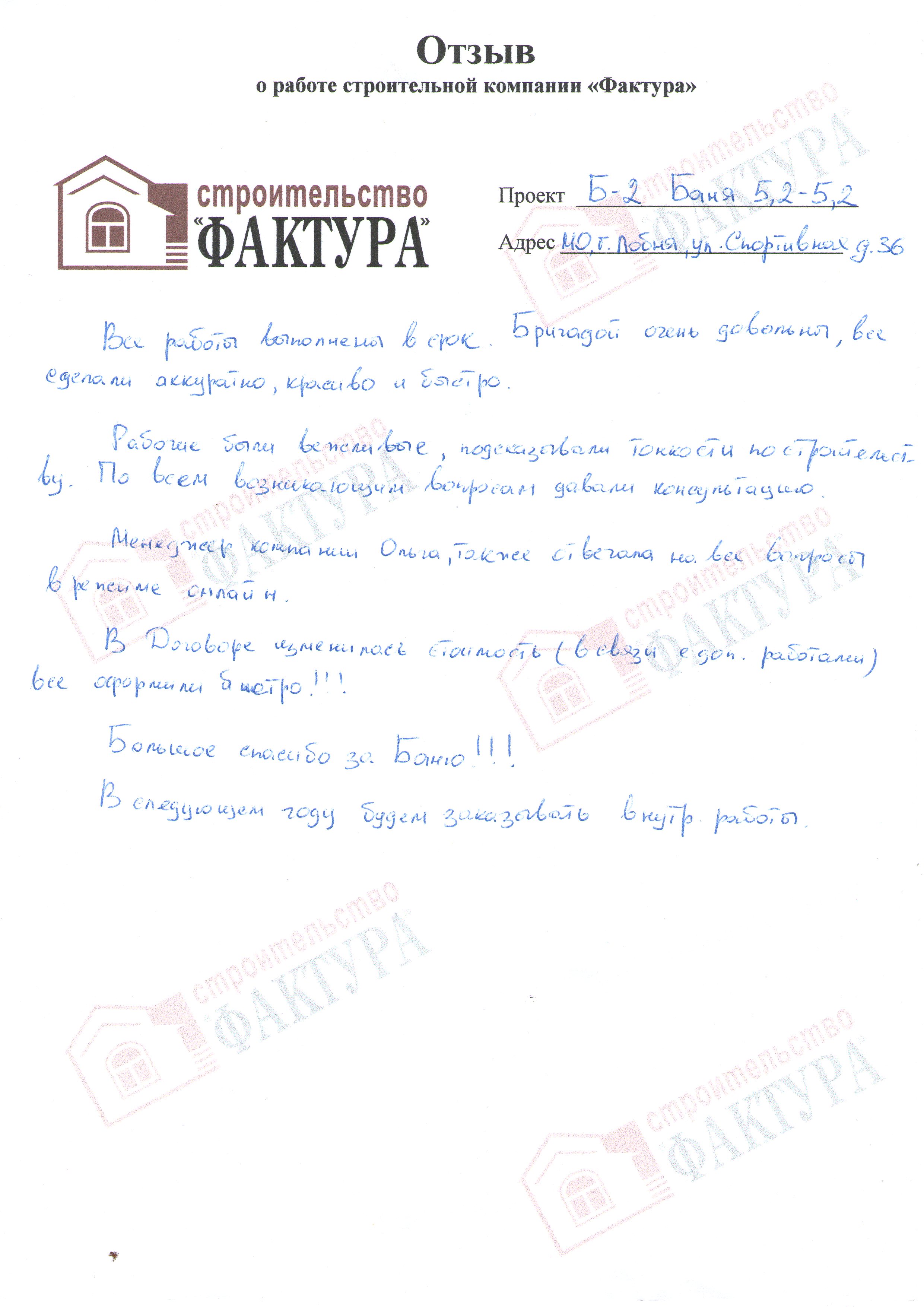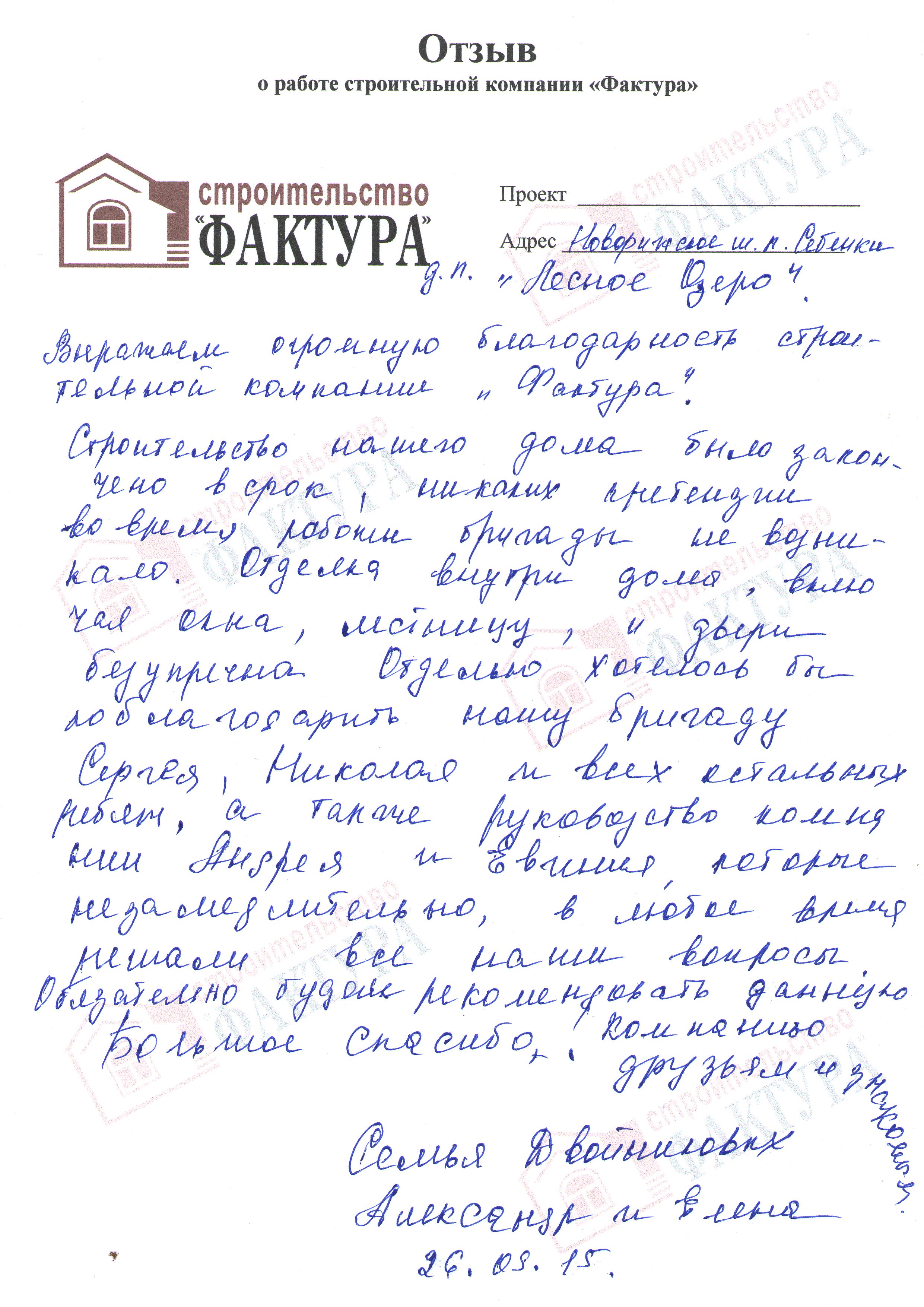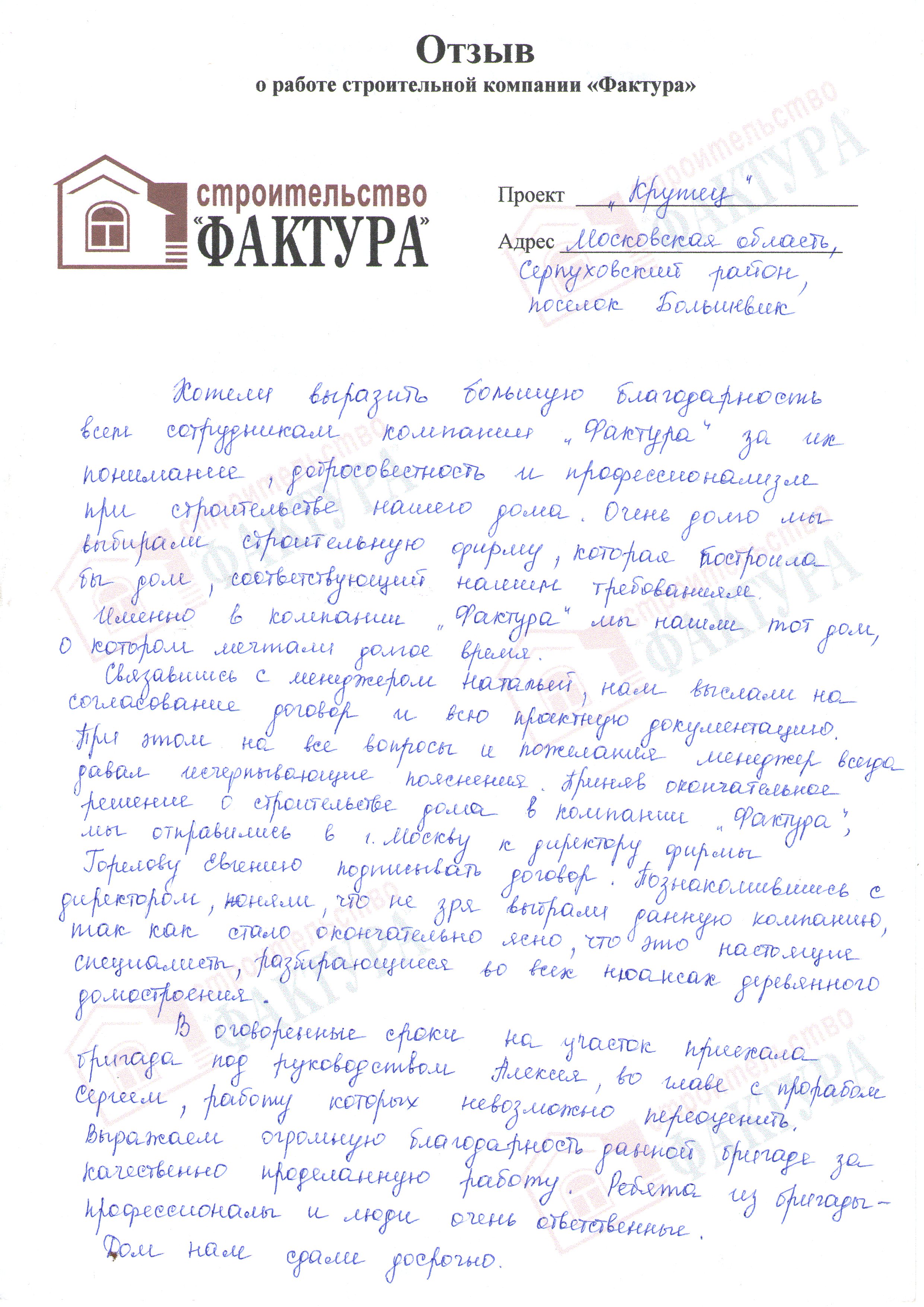 Хотели выразить большую благодарность всем сотрудникам компании «Фактура» за их понимание, добросовестность и профессионализм при строительстве нашего дома. Очень долго мы выбирали строительную фирму, которая построила бы дом, соответствующий нашим требованиям. Именно в компании «Фактура» мы нашли тот дом, о котором мечтали долгое время. Связавшись с менеджером Натальей, нам выслали на согласование договор и всю проектную документацию. При этом на все вопросы и пожелания менеджер всегда давал исчерпывающие пояснения.