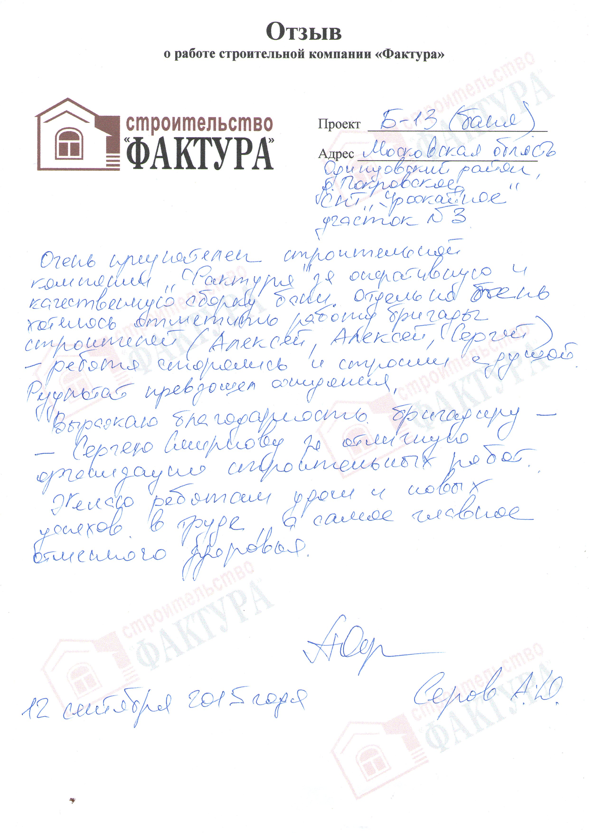 Выражаю большую благодарность всем руководителям фирмы и строителям, принимавшим участие. 20.09.2015