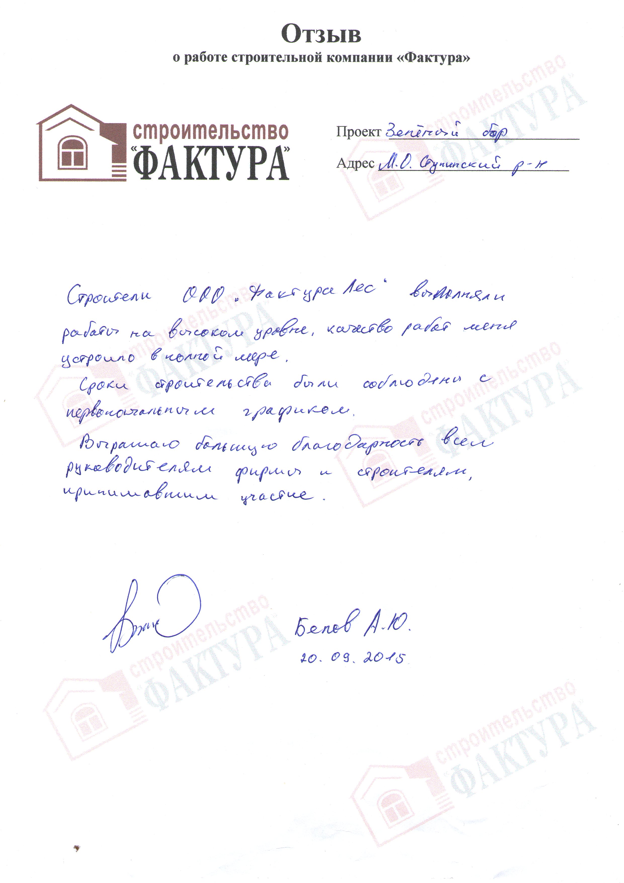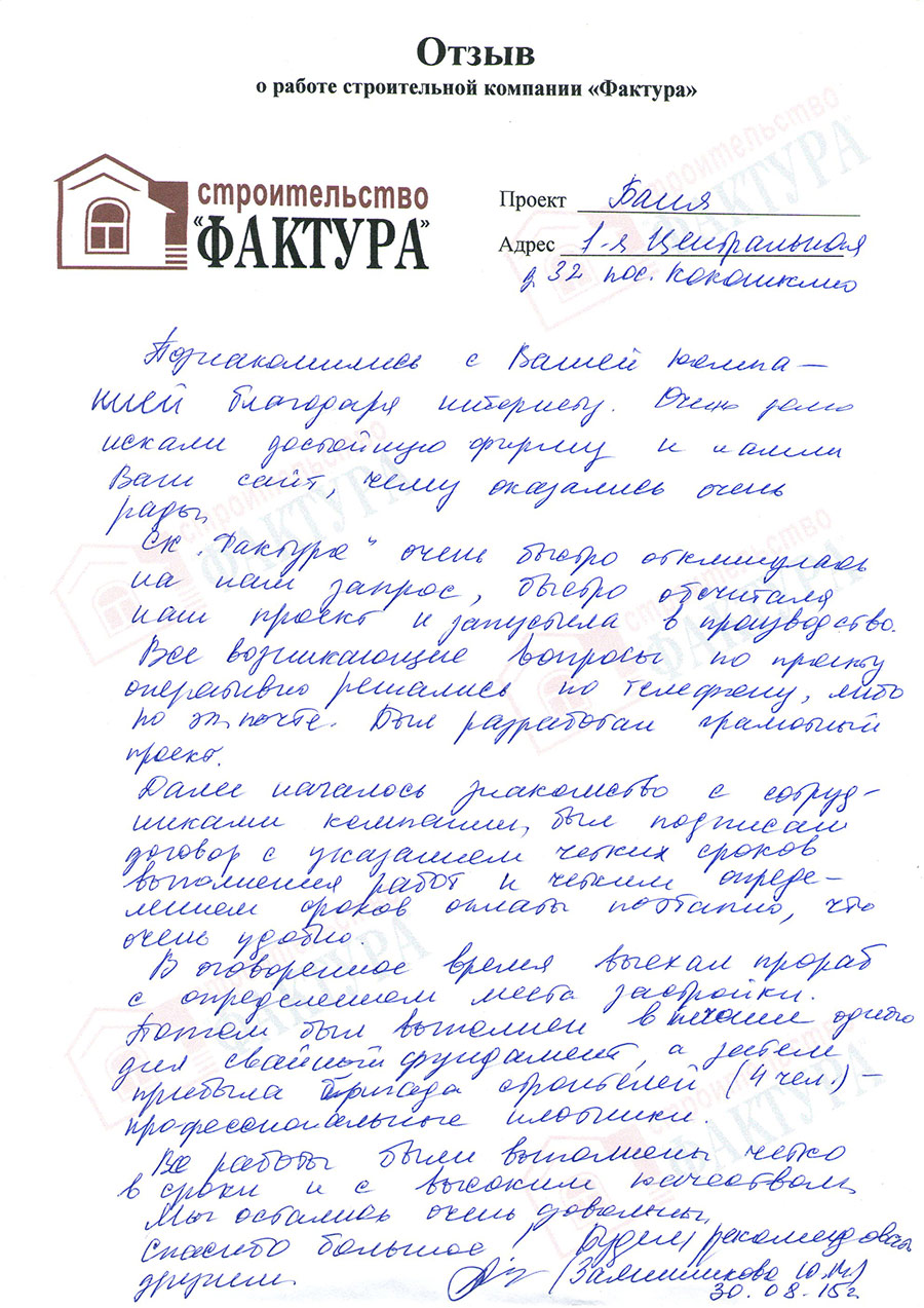 Сейчас, когда работы почти завершены и хочу заметить в очень короткие сроки (погода нас не подводила), то что бригада сработала за такое время это заслуживает большого уважения, я очень довольна что не ошиблась и заключила договор строительства с компанией «Фактура», побольше бы таких компаний и таких ответственных людей. Желаю компании побольше клиентов и дальнейшего процветания.