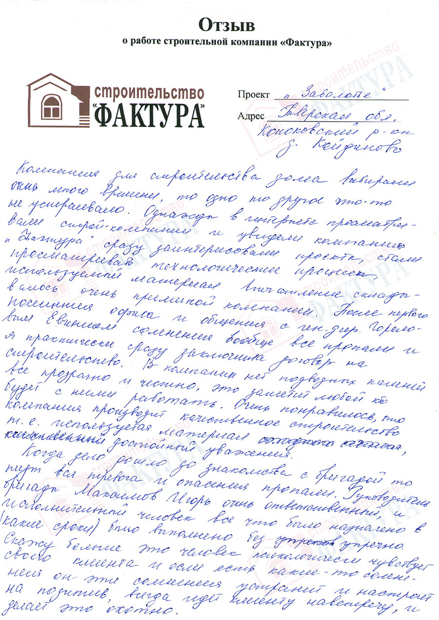 Компанию для строительства дома выбирали очень много времени, то одно то другое что-то не устраивало. Однажды в интернете просматривали строй- компании и увидели компанию «Фактура» сразу заинтересовали проекты, стали просматривать технологические процессы, используемый материал впечатление складывалось очень приличной компании. После первого посещения офиса и общения с ген. дир. Гореловым Евгением сомнения вообще все пропали и я практически сразу заключила договор на строительство. В компании нет подводных камней все прозрачно и честно, это заметит любой, кто будет с ними работать. Очень понравилось, что компания производит качественное строительство т.е. используется материал достойный уважения.