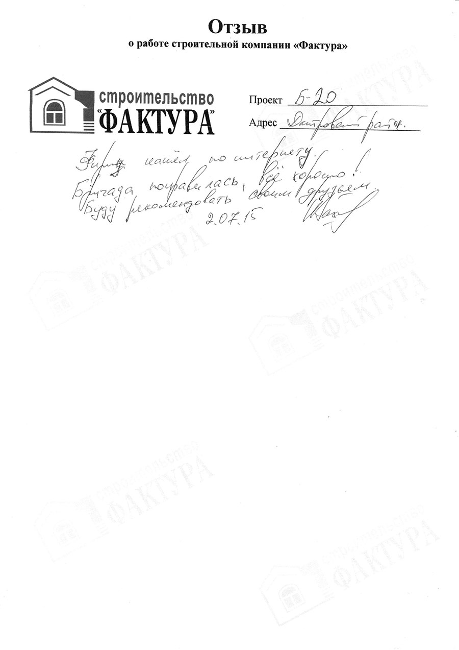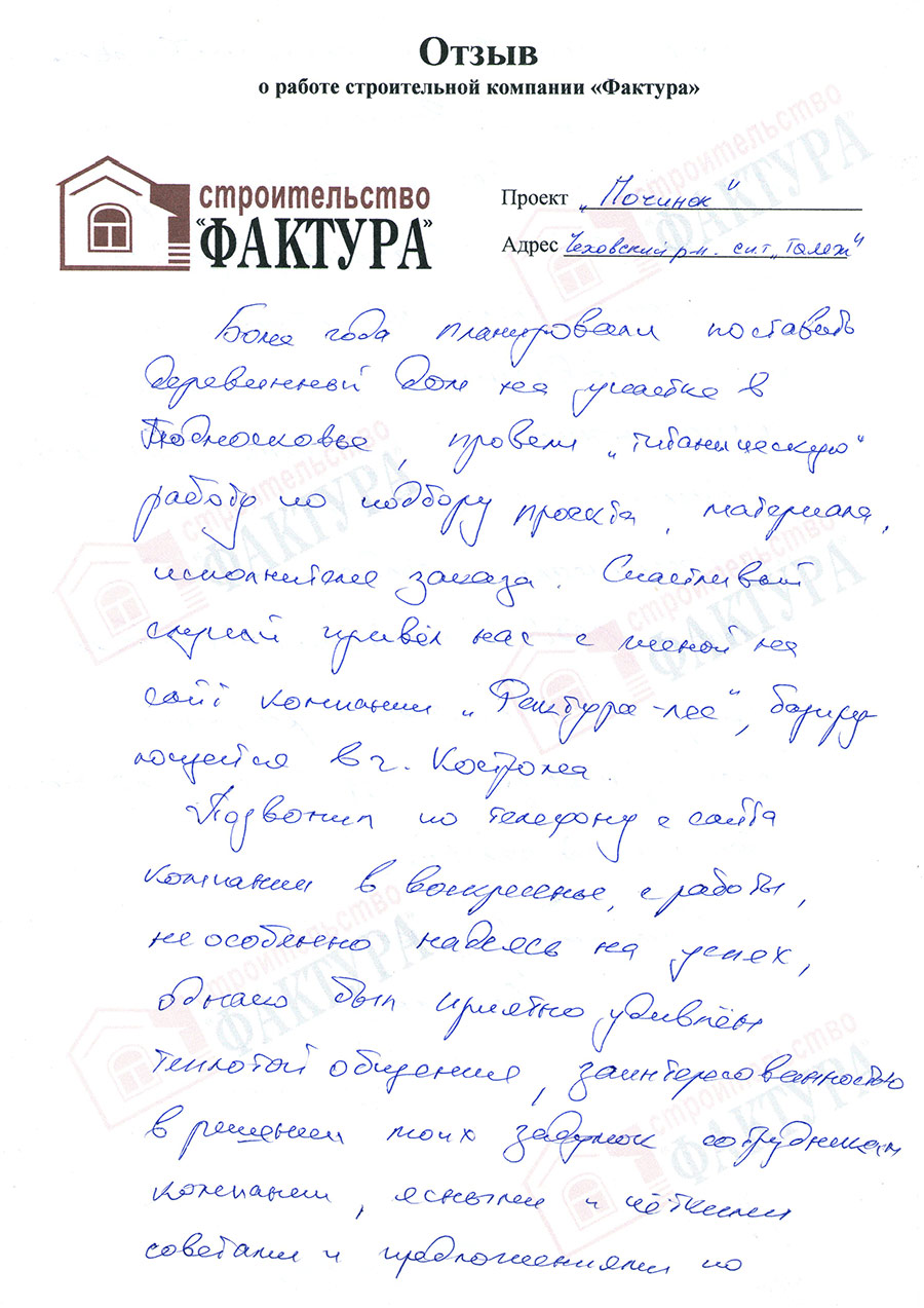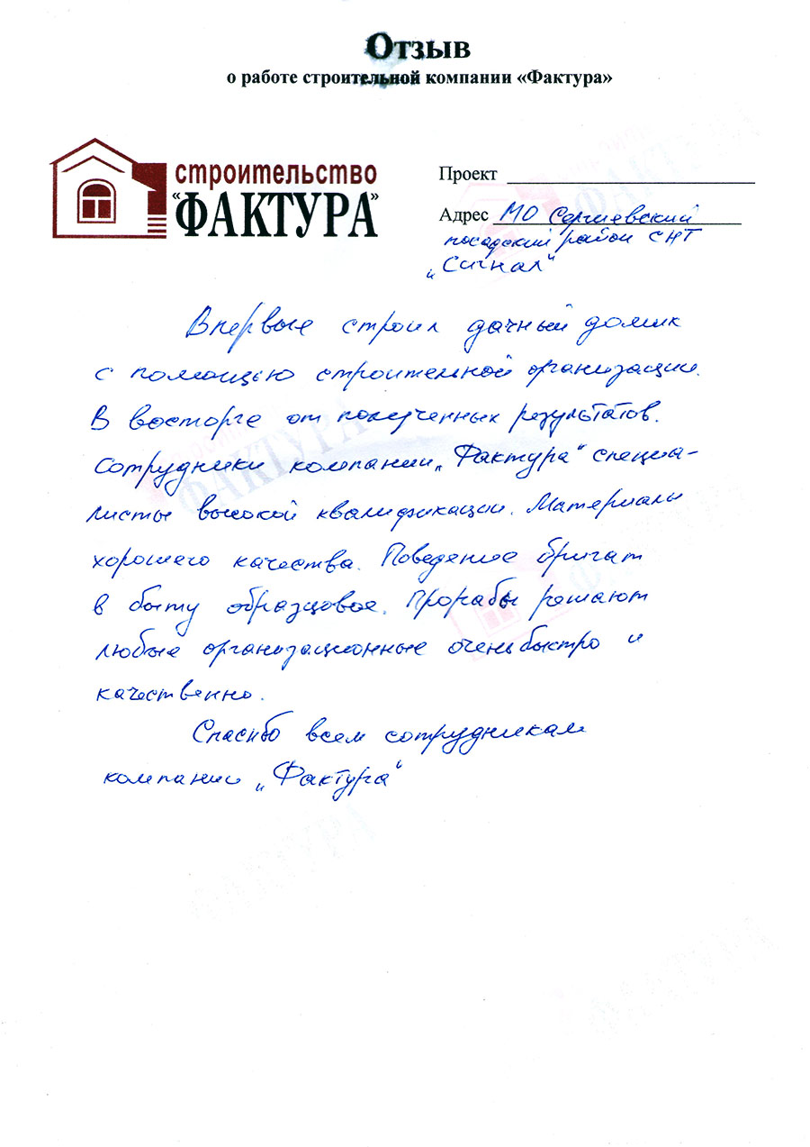 Долго выбирали строительную фирму и остановились на «Фактура». Понравился сайт, проекты домов и ген. директор Евгений своим отношением и внимательностью. Бригада строителей приехала в нужное время, все мастера замечательные (и по фундаменту и по дому). Особенно хорошее впечатление произвел прораб Игорь своей внимательностью и профессионализмом. Бригада строителей: Анатолий, Андрей, Сергей и Игорь построили замечательный дом, мы очень довольны. Ребята профессионалы своего дела и хорошие люди.