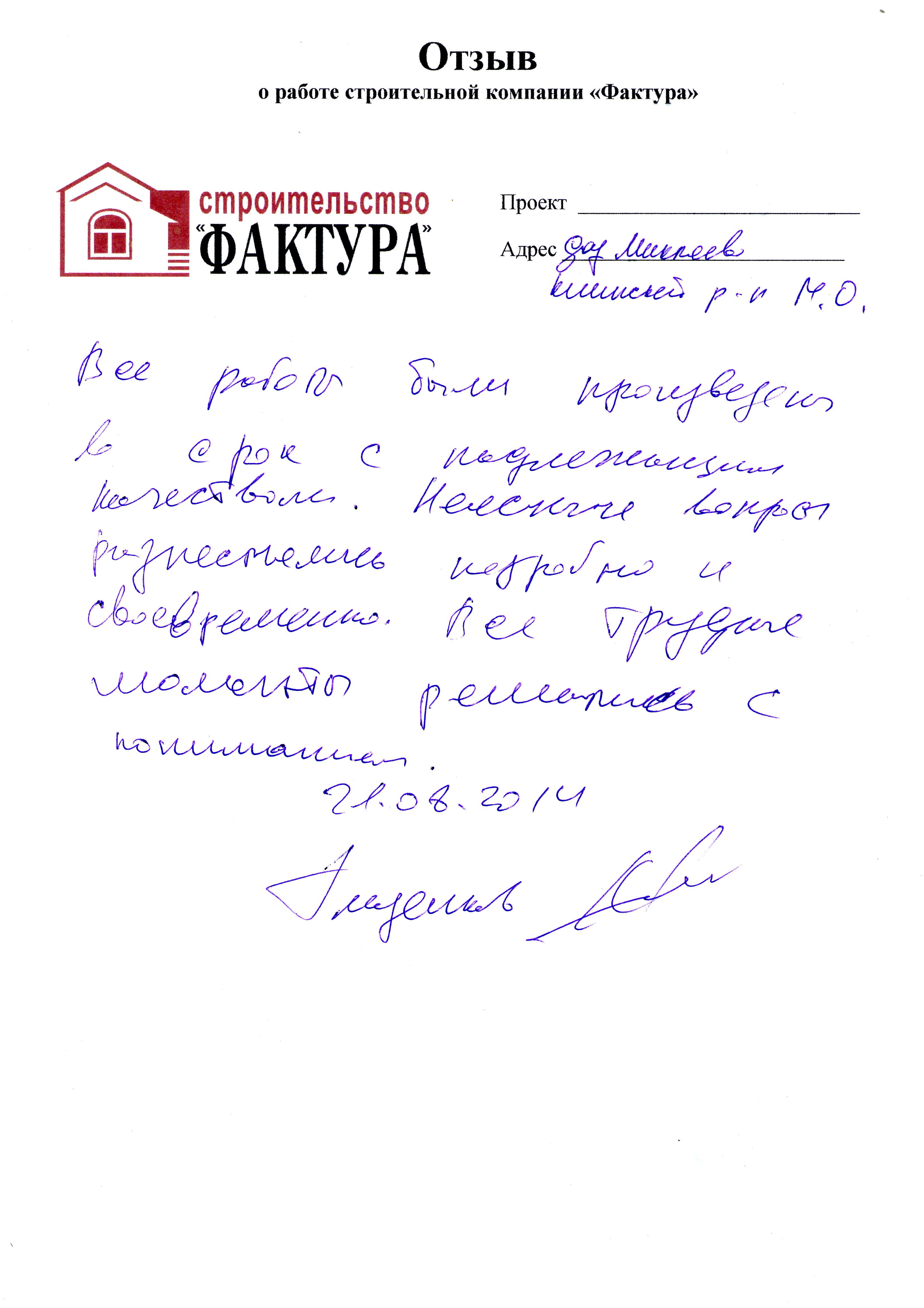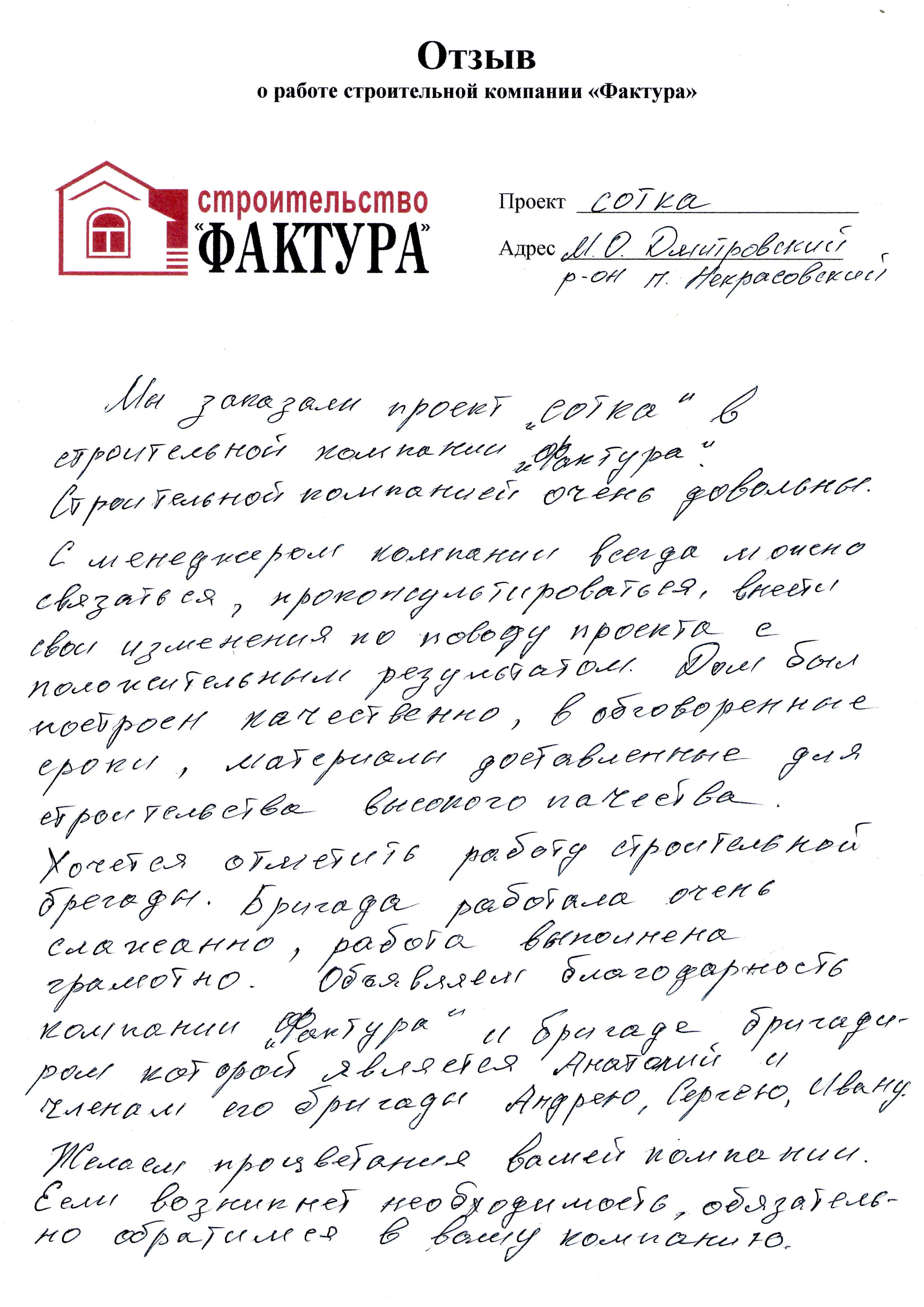 Мы заказали проект «Сотка» в строительной компании «Фактура». Строительной компанией очень довольны. С менеджером компании всегда можно связаться, проконсультироваться, внести свои изменения по поводу проекта с положительным результатом. Дом был построен качественно, в обговоренные сроки, материалы доставлены для строительства высокого качества. Хочется отметить работу строительной бригады. Бригада работала очень сложено, работа выполнена грамотно. Объявляем благодарность компании «Фактура» и бригаде бригадиром которой является Анатолий и членам его бригады Андрею, Сергею, Ивану. Желаем процветания вашей компании. Если возникнет необходимость, обязательно обратимся в вашу компанию.
