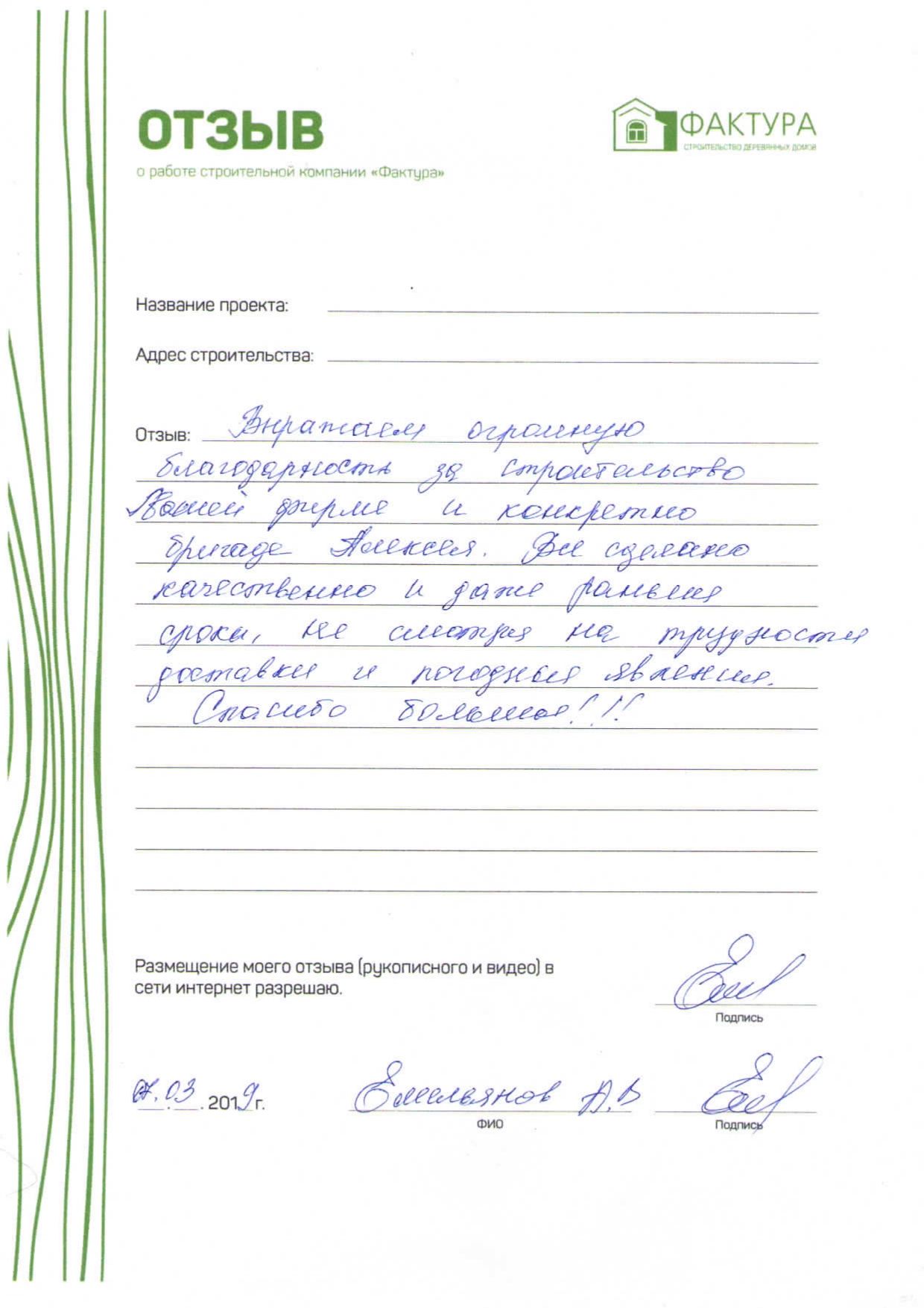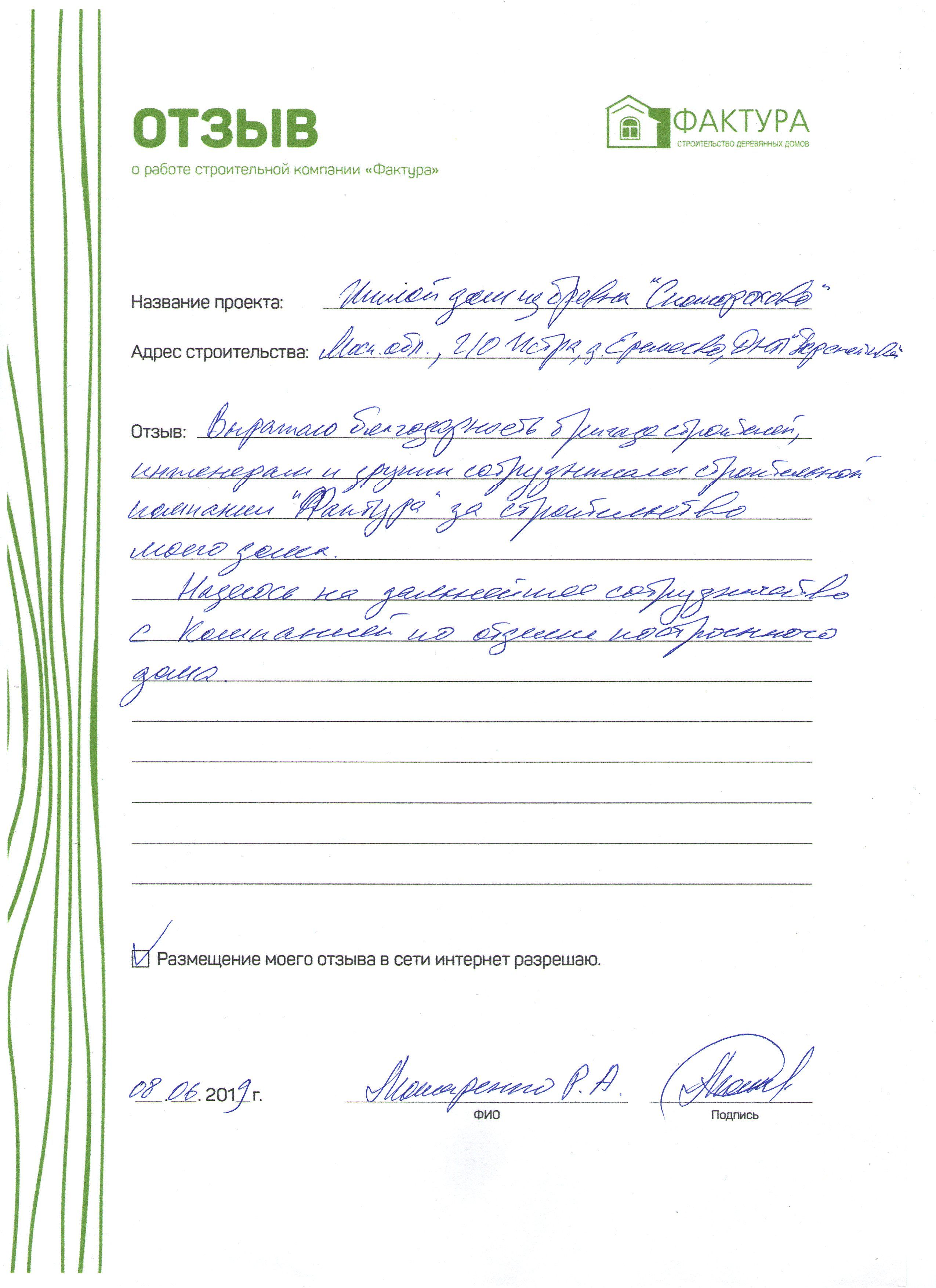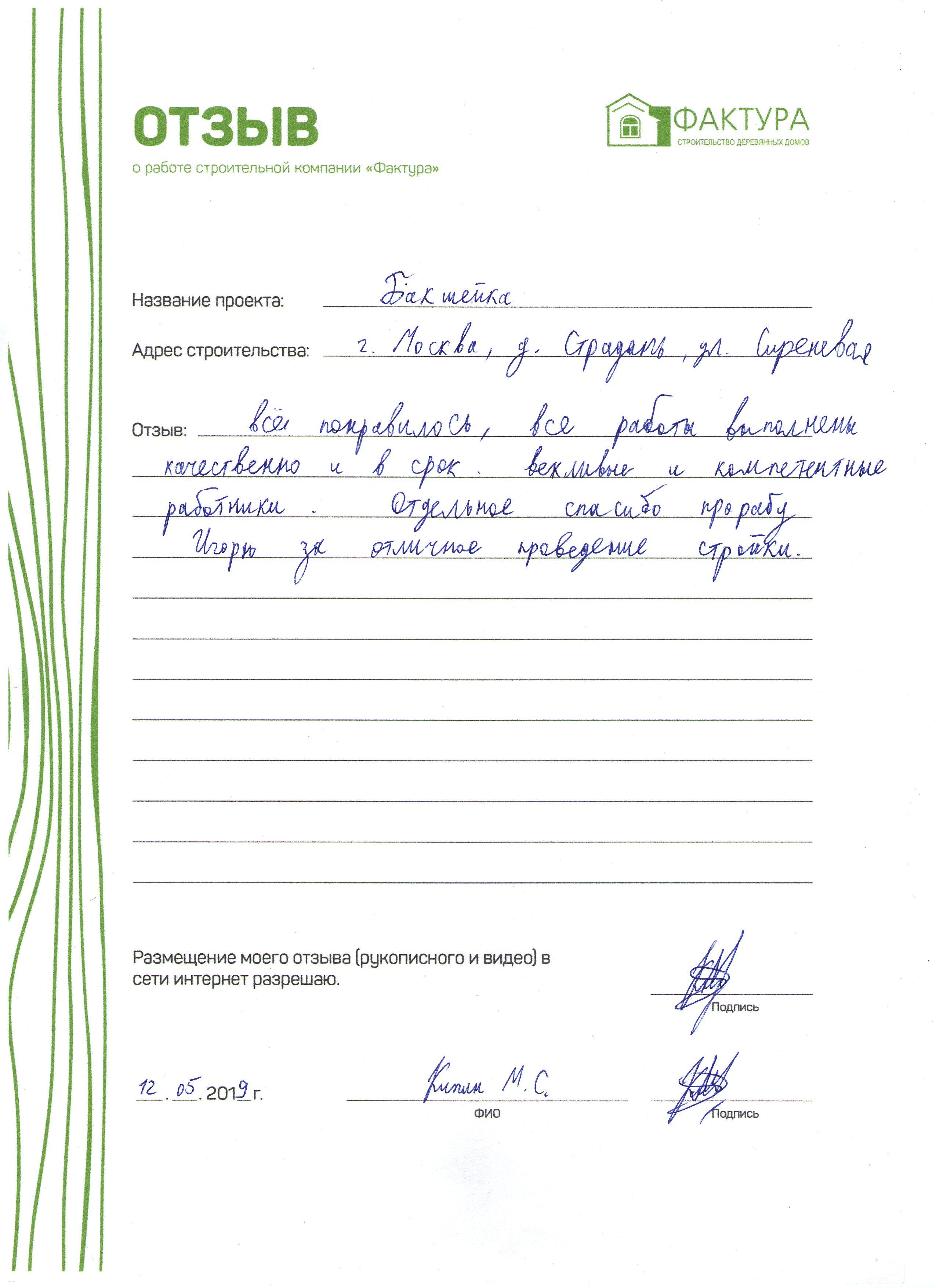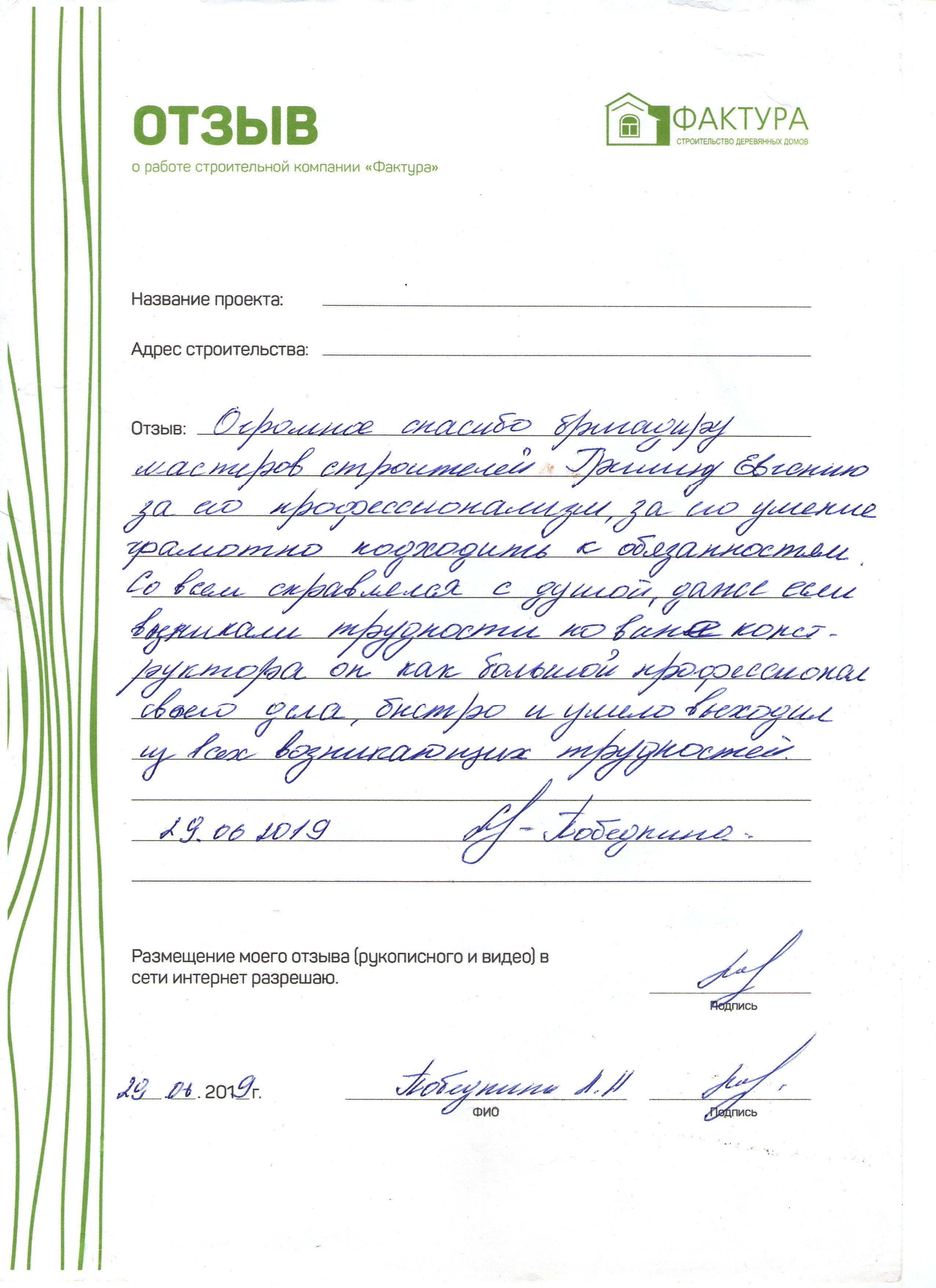 Выражаю благодарность бригаде строителей, инженерам и другим сотрудникам строительной компании «Фактура» за строительство моего дома. Надеюсь на дальнейшее сотрудничество с компанией по отделке построенного дома.
