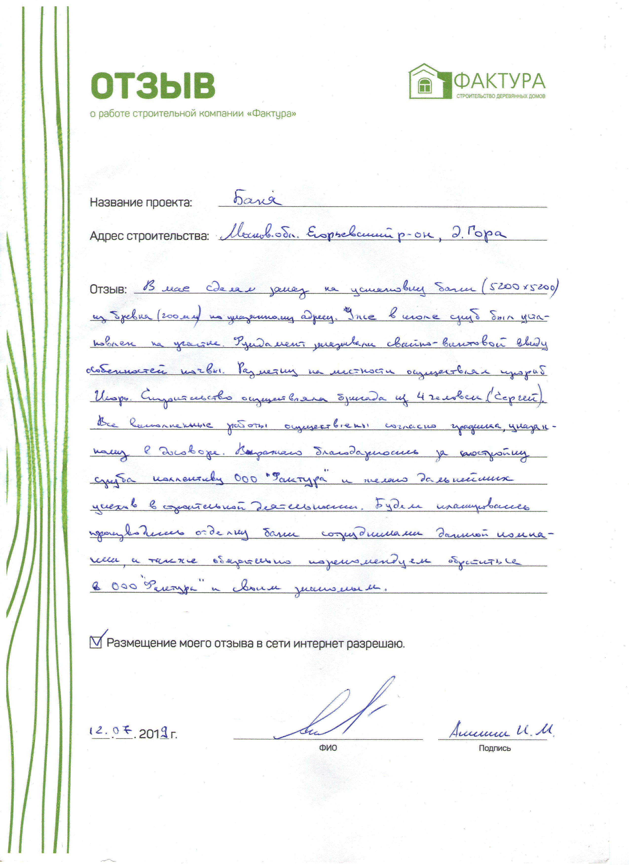 В мае сделали заказ на установку бани (5200 х 5200) из бревна (200 мм) по указанному адресу. Уже в июле сруб был доставлен на участок. Фундамент заказывали свайно-винтовой ввиду особенностей почвы. Разметку на местности осуществлял прораб Игорь. Строительством занималась бригада из 4-х человек. Все работы выполнены согласно графику, указанному в договоре. Выражаю благодарность за постройку сруба коллективу ООО «Фактура» и желаю дальнейших успехов в строительной деятельности. Планируем обратиться за отделкой бани тоже к сотрудникам данной компании, а также обязательно порекомендуем ООО «Фактура» своим знакомым.