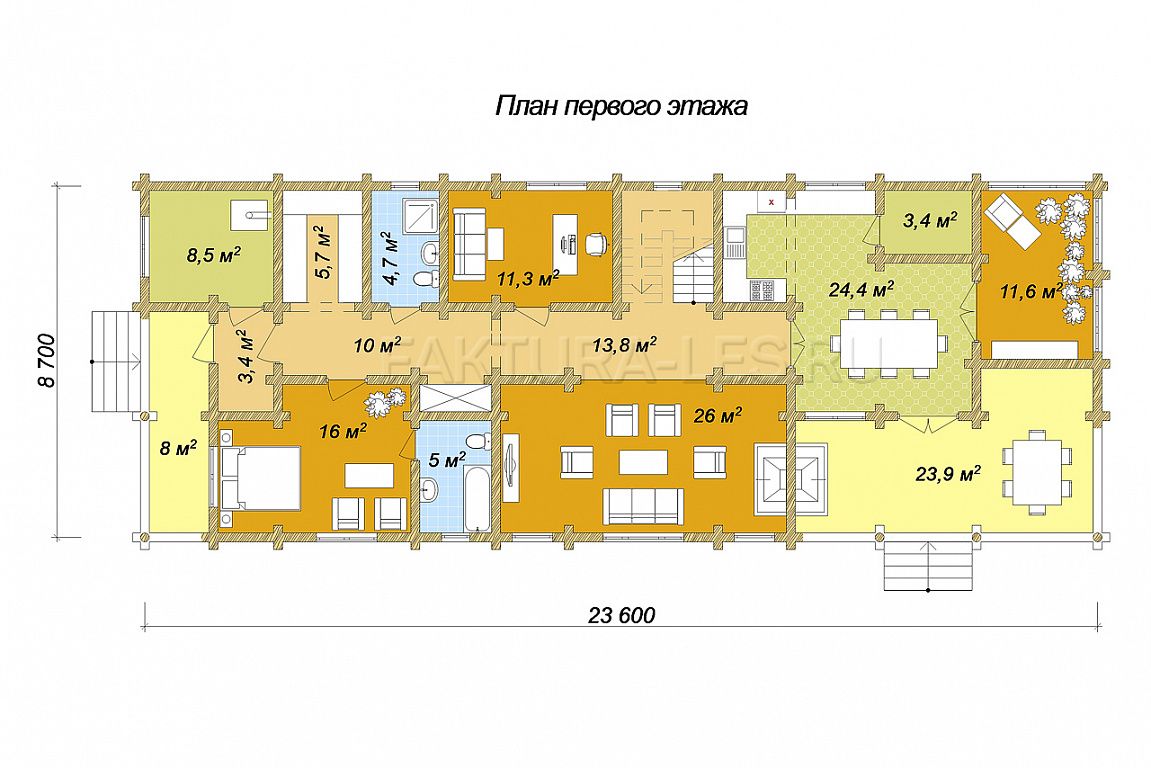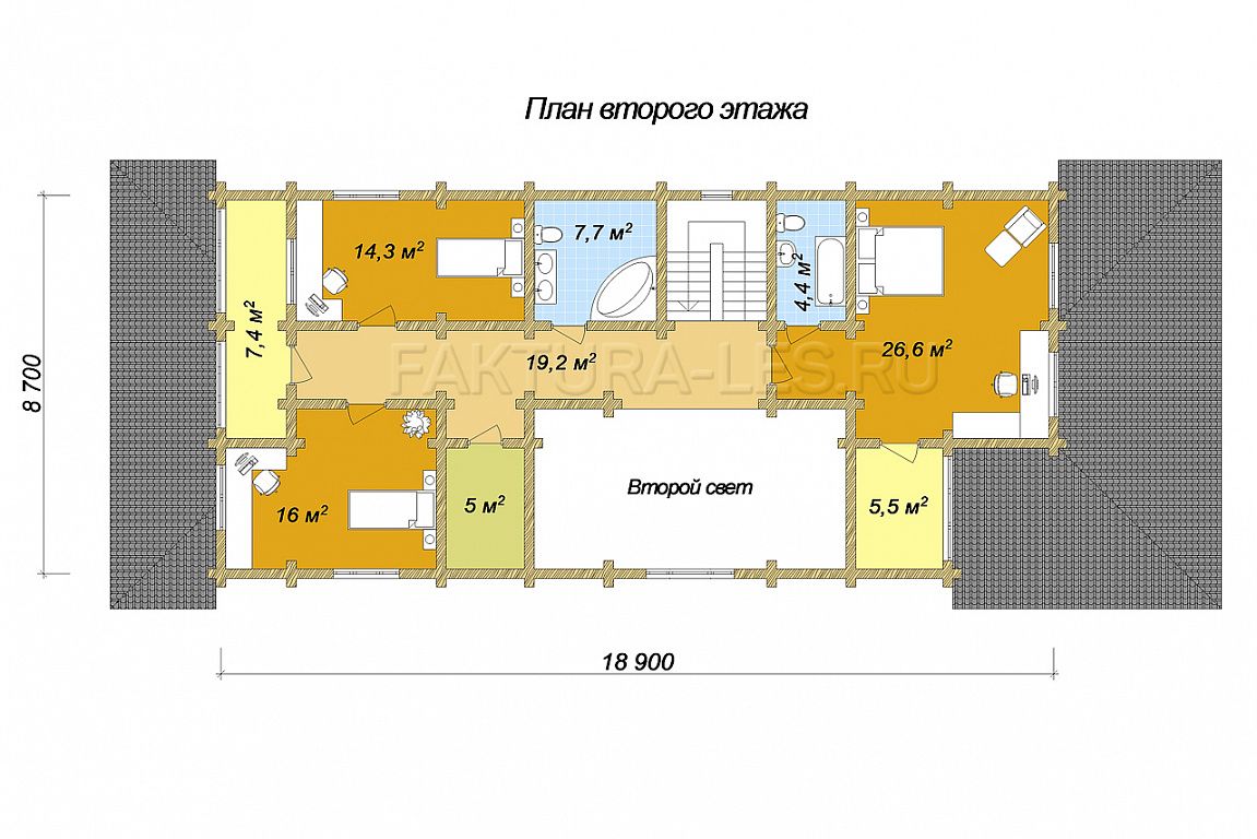 Обращаем Ваше внимание, что в данную комплектацию не входят отделочные работы и материалы, работы по устройству коммуникаций, окна, двери, лестница, каркасные перегородки (изображены на планах белым цветом). Все эти работы производятся после усадки капитальных стен, через 8-12 месяцев после монтажа сруба.