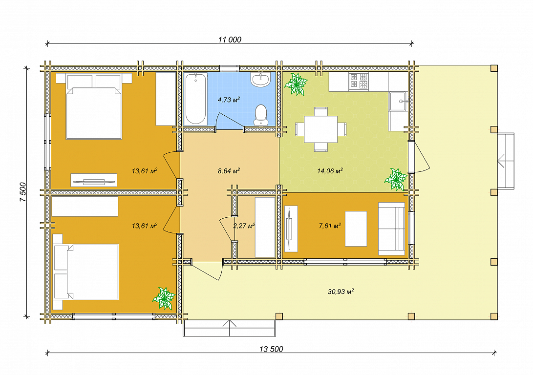 • Балки перекрытия из доски камерной сушки 45 × 195 мм. с шагом 600 мм.