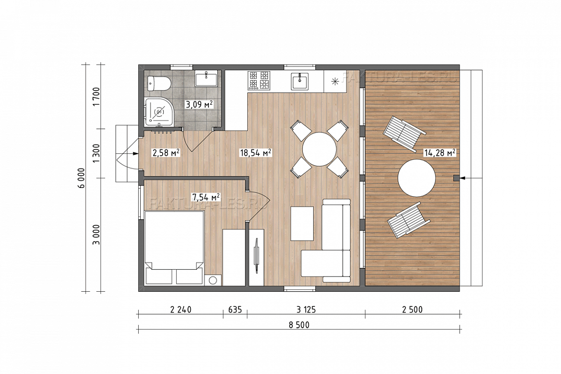 • Чистовые полы выполнены из шпунтованной доски камерной сушки 35×135 мм. сорт АБ, на верандах и балконах - палубная доска 35×144 мм.