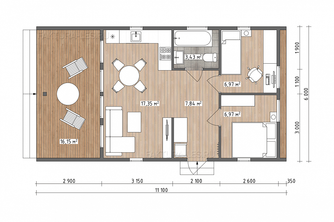 • Чистовые полы выполнены из шпунтованной доски камерной сушки 35×135 мм. сорт АБ, на верандах и балконах - палубная доска 35×144 мм.