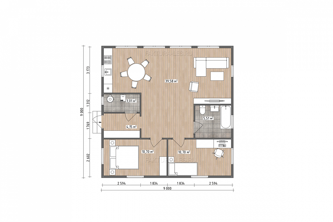 • Чистовые полы выполнены из шпунтованной доски камерной сушки 35×135 мм. сорт АБ, на верандах и балконах - палубная доска 35×144 мм.